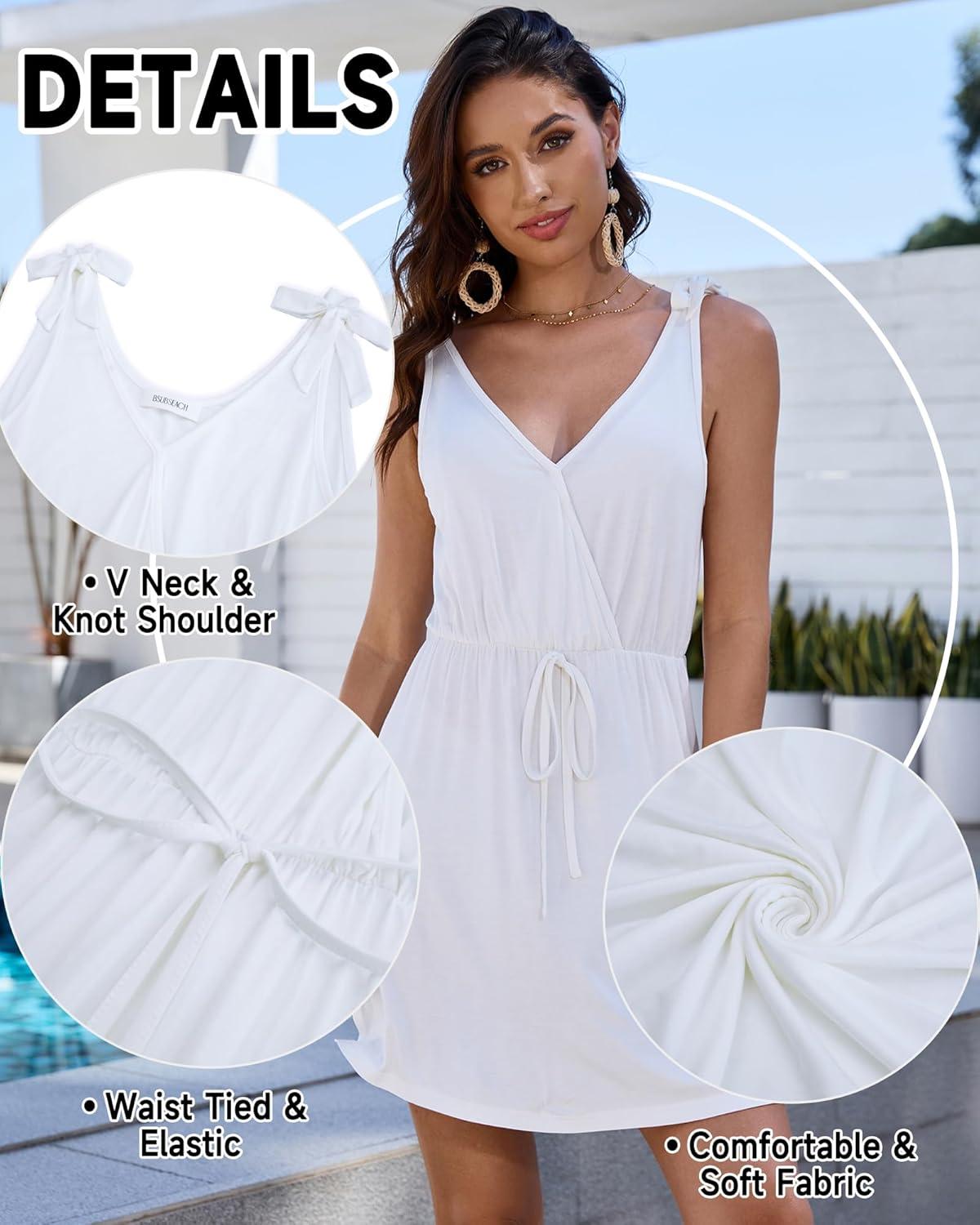 Bsubseach Beach Cover Ups Dress – Women V Neck Swimsuit Coverup Elastic Waist Summer Coverups for Swimwear Mini Dresses(White)