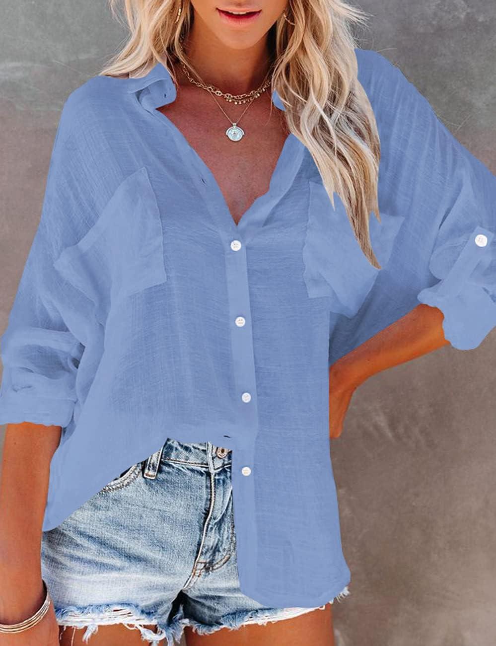 Bsubseach Button Down Swim Cover Up Shirt Sexy Long Sleeve Beach Blouse Bathing Suit Cover Ups for Women(Blue)