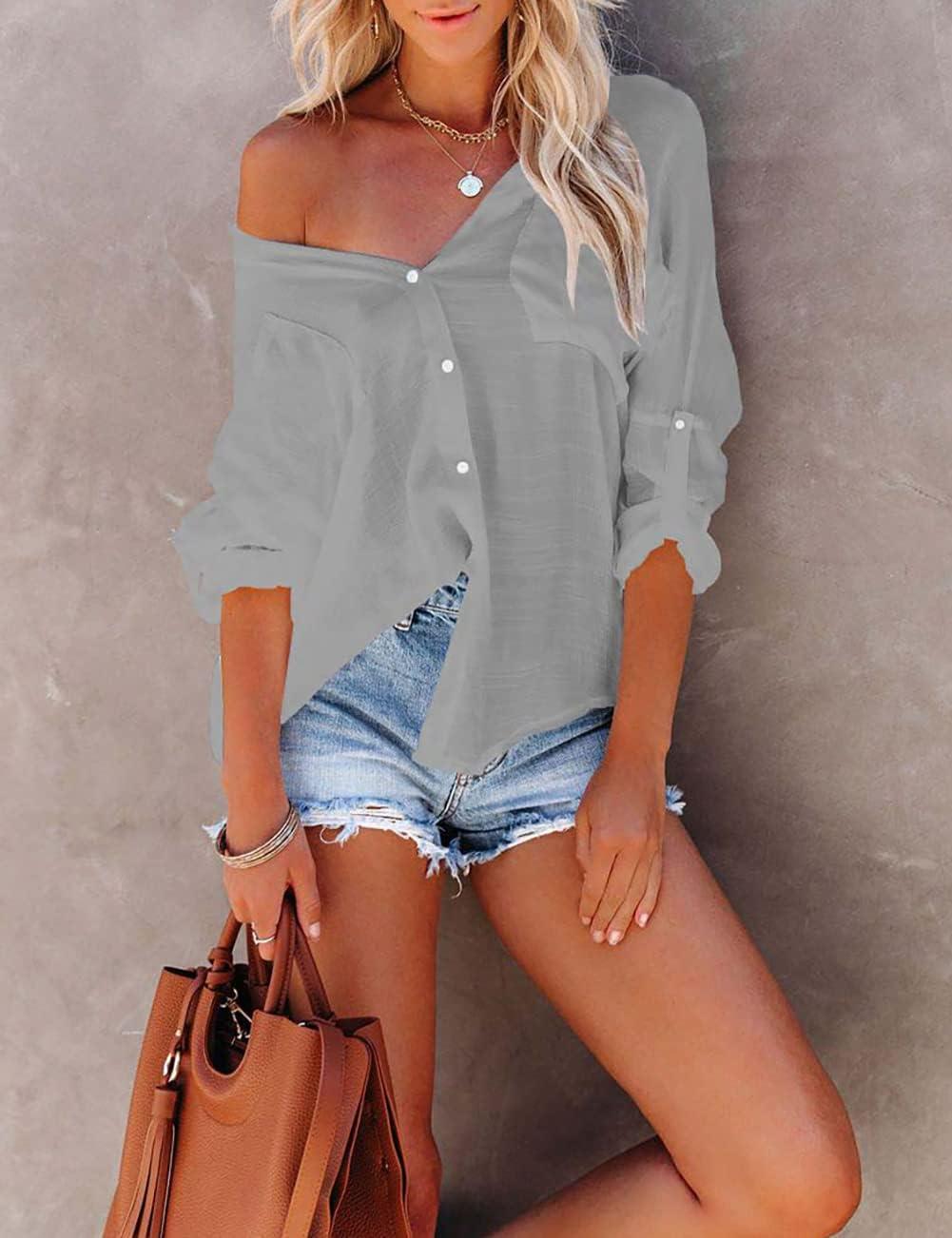Bsubseach Button Down Swim Cover Up Shirt Sexy Long Sleeve Beach Blouse Bathing Suit Cover Ups for Women(Grey)
