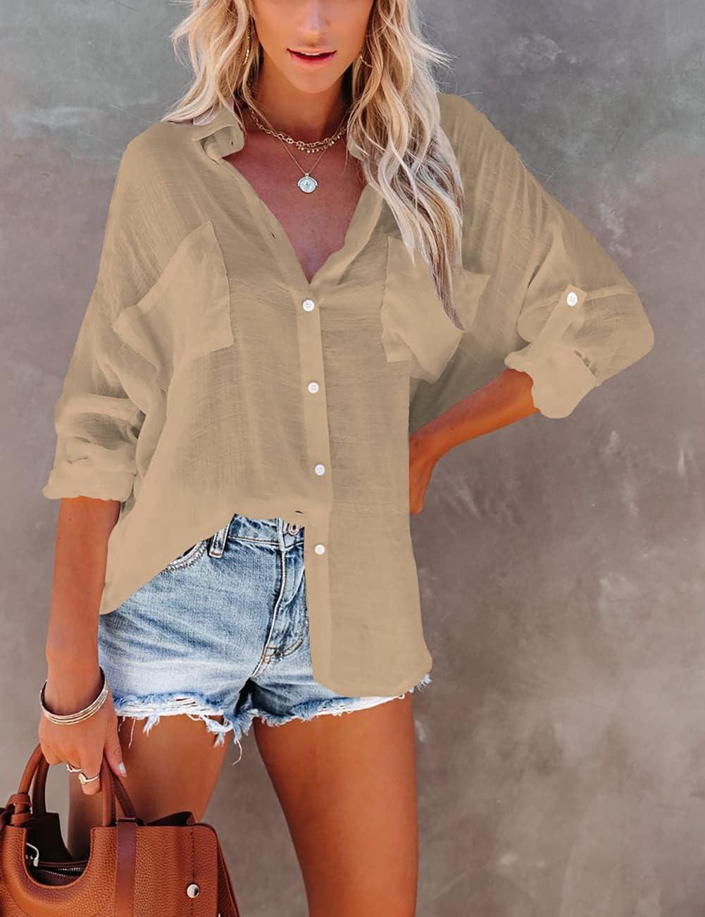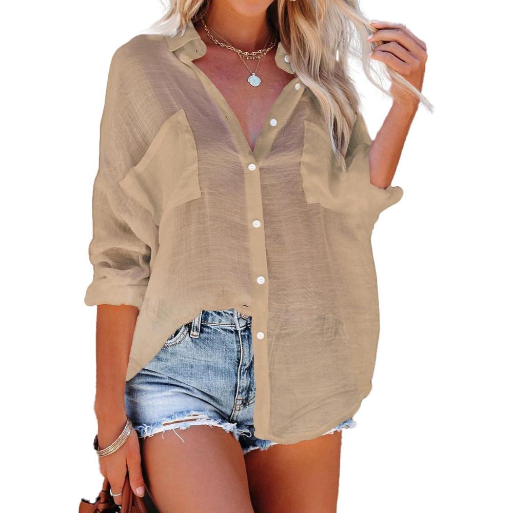 Bsubseach Button Down Swim Cover Up Shirt Sexy Long Sleeve Beach Blouse Bathing Suit Cover Ups for Women(Khaki)