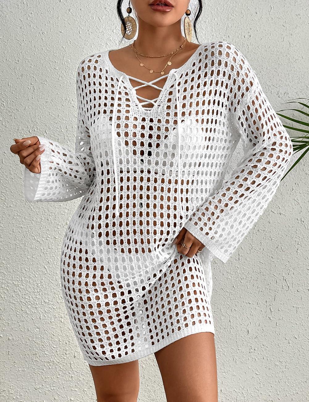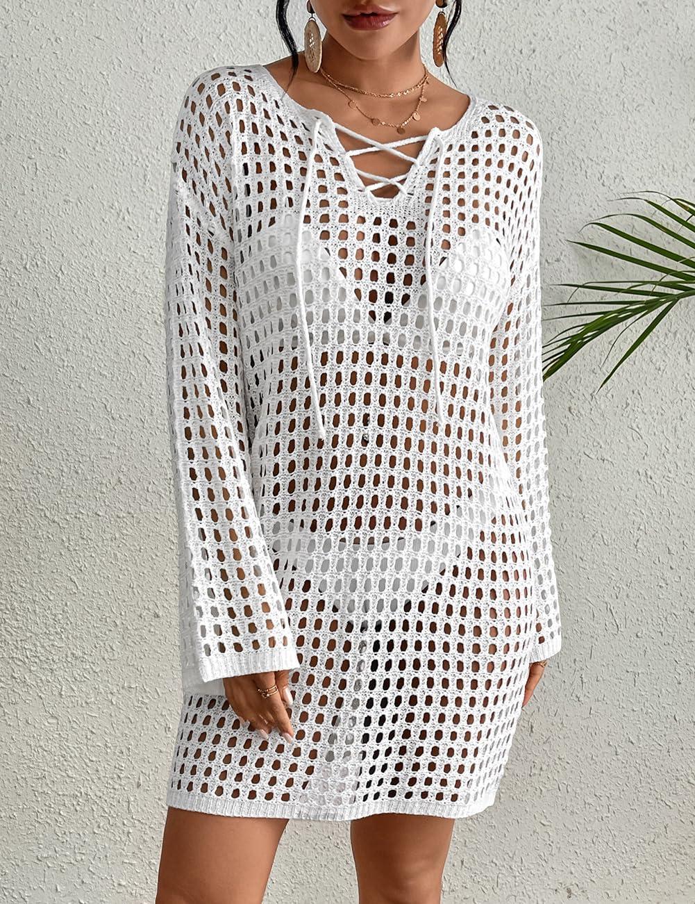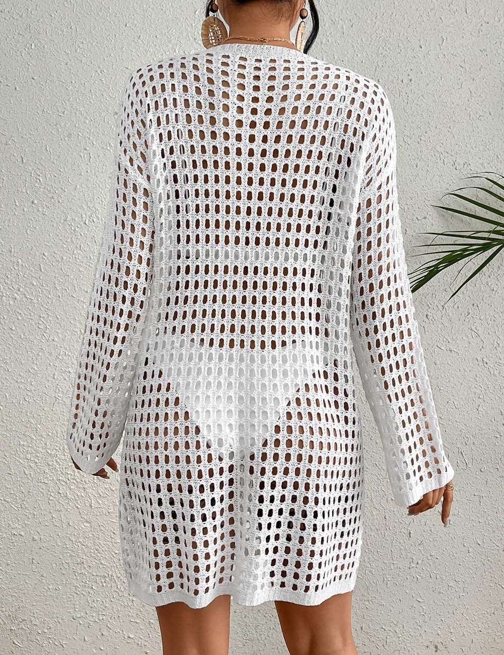 Bsubseach Casual Women Swim Cover Up Long Sleeve Beach Dress Sexy Crochet Coverup(White)