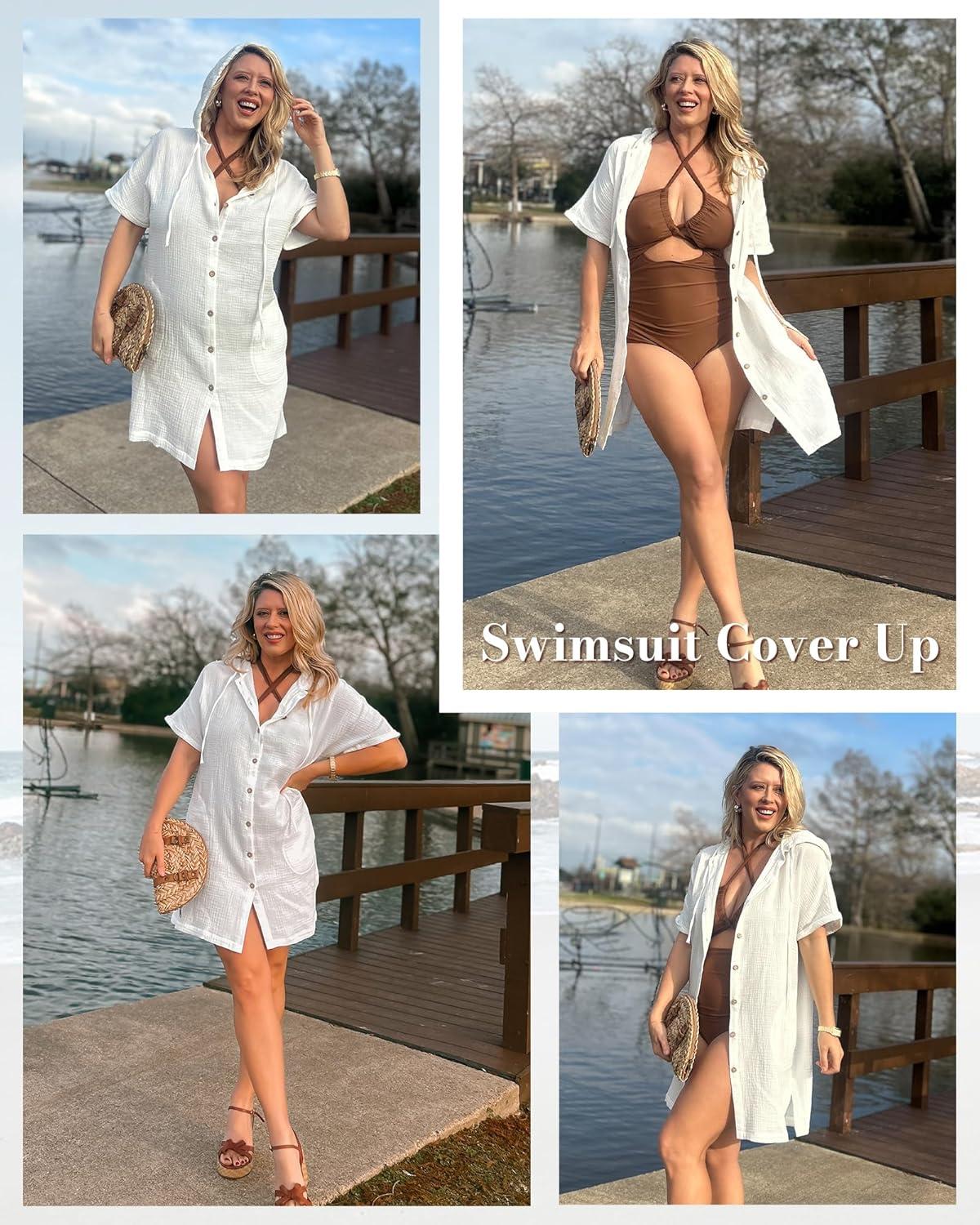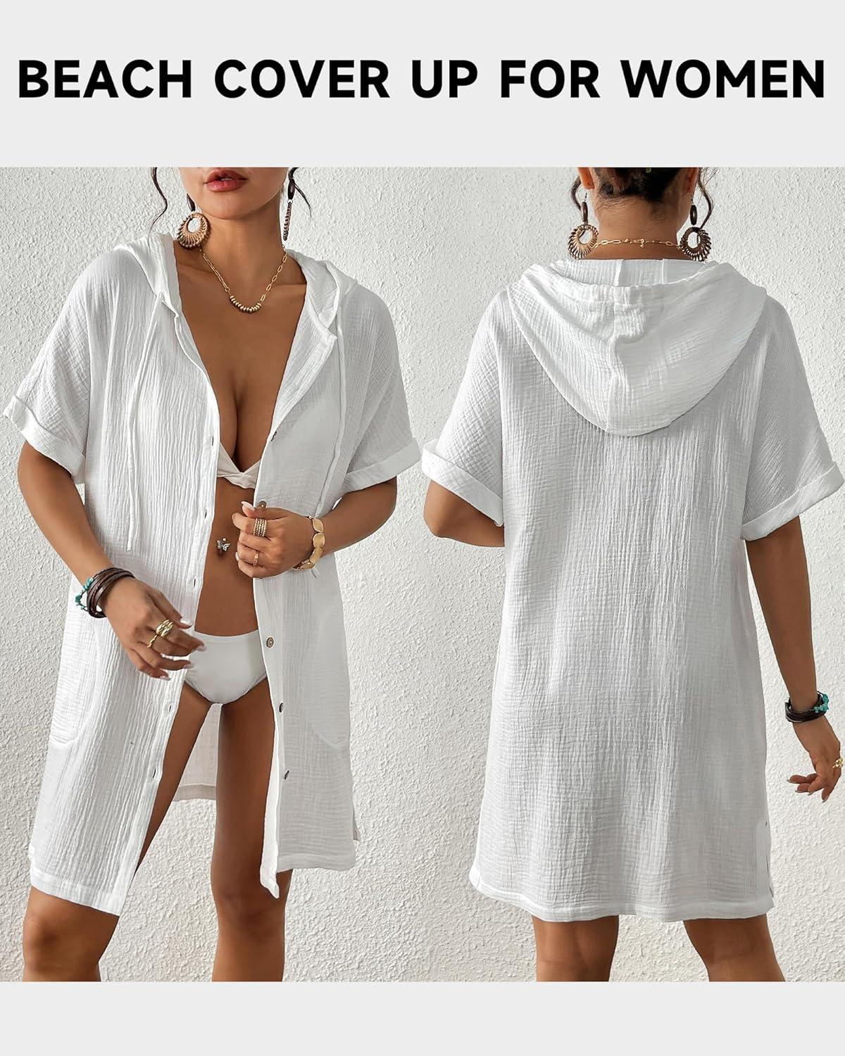 Bsubseach Cotton Swimsuit Cover Up For Women 2025 Button Down Hooded Shirt Short Sleeve Beach Cover Ups With Pockets(White)