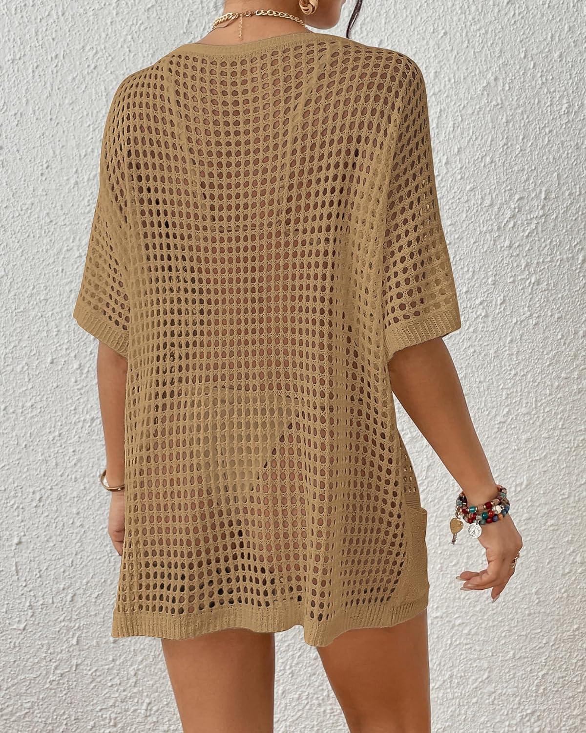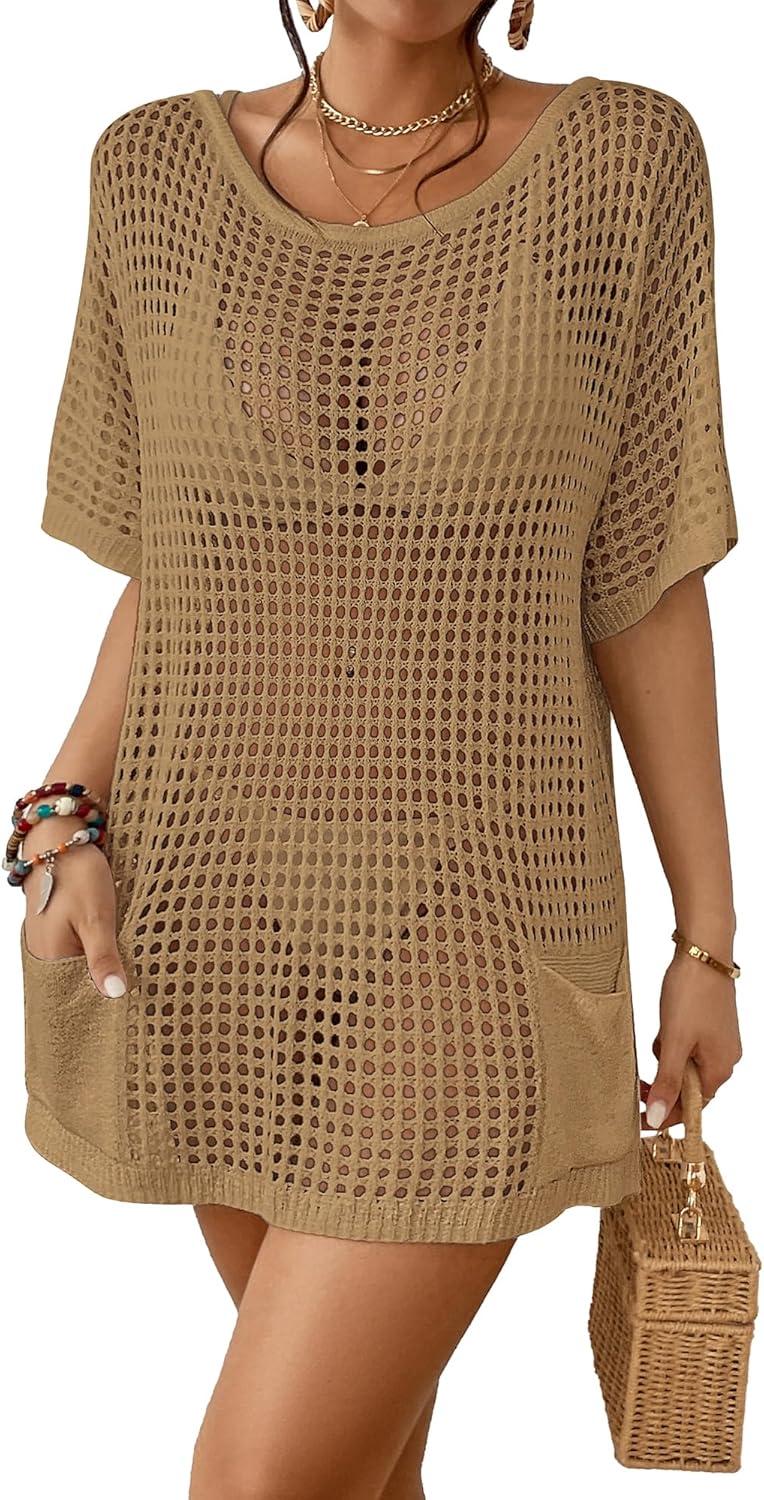 Bsubseach Crochet Coverup for Women Mesh Swimsuit Cover Up Hollow Out Bathing Suit Beach Cover Ups with Pockets(Camel)
