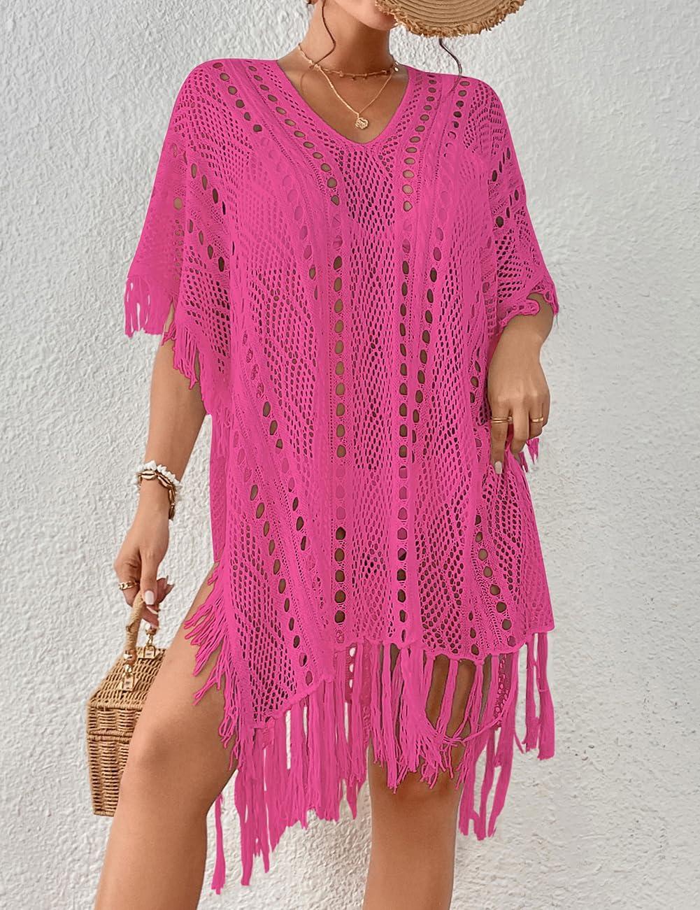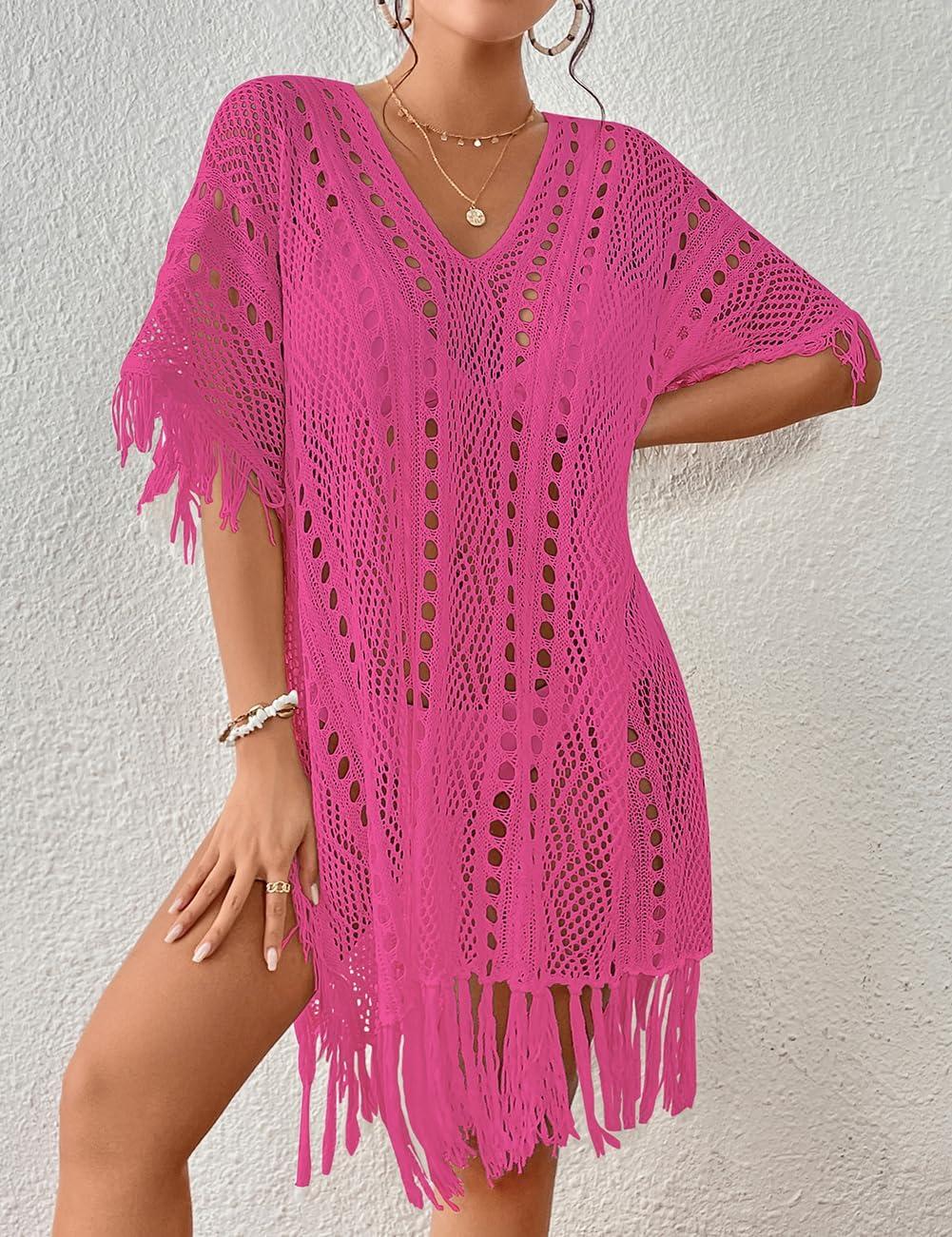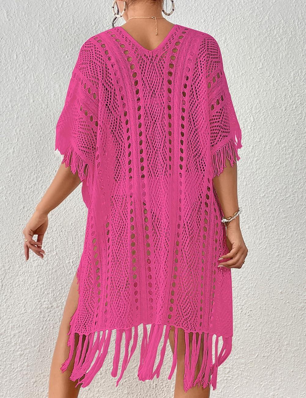 Bsubseach Crochet Coverups for Women Tassel Hollow Out Slit Swimsuit Coverup Bathing Suit Cover Up Beach Dress(Rose Red)