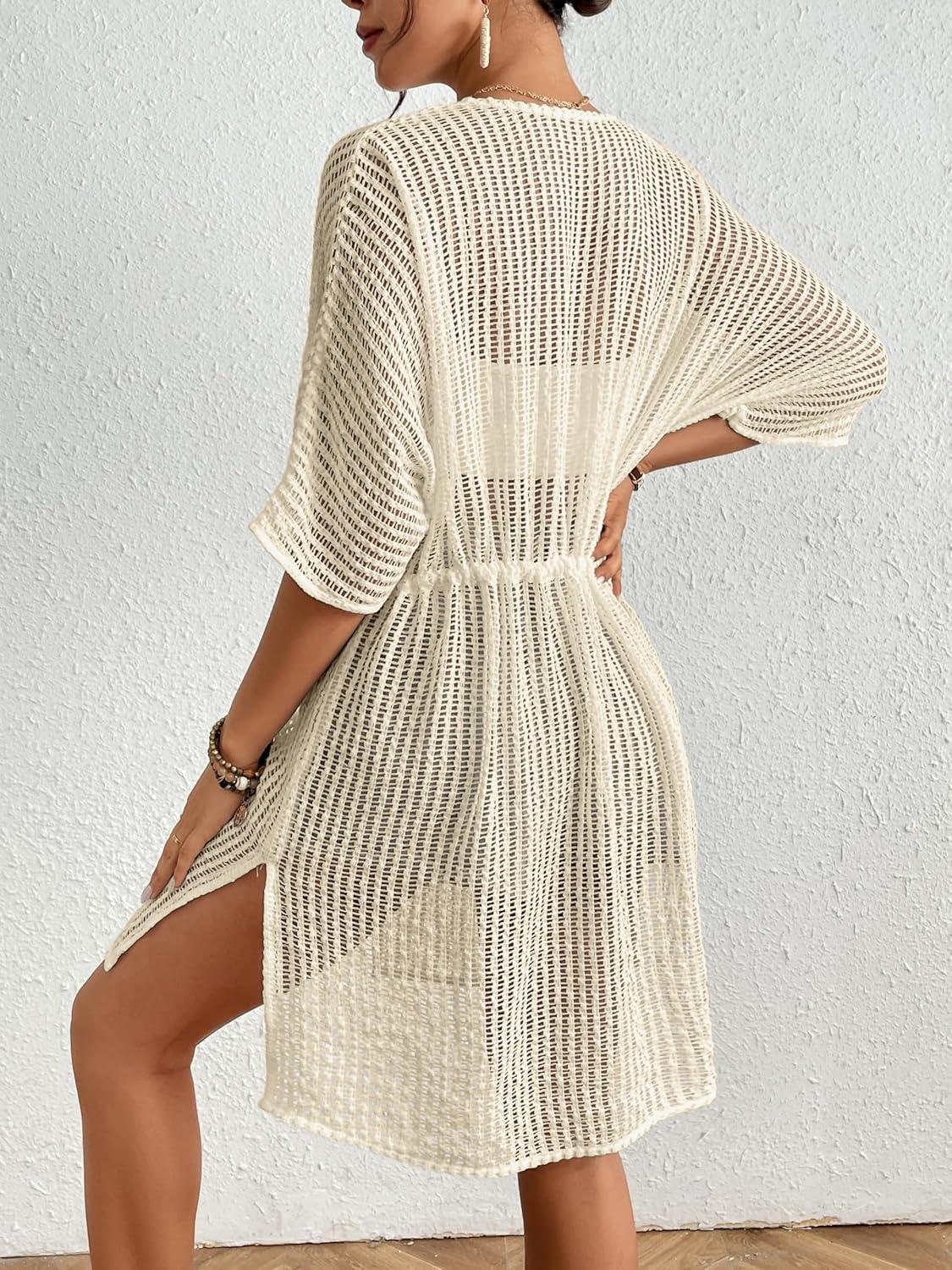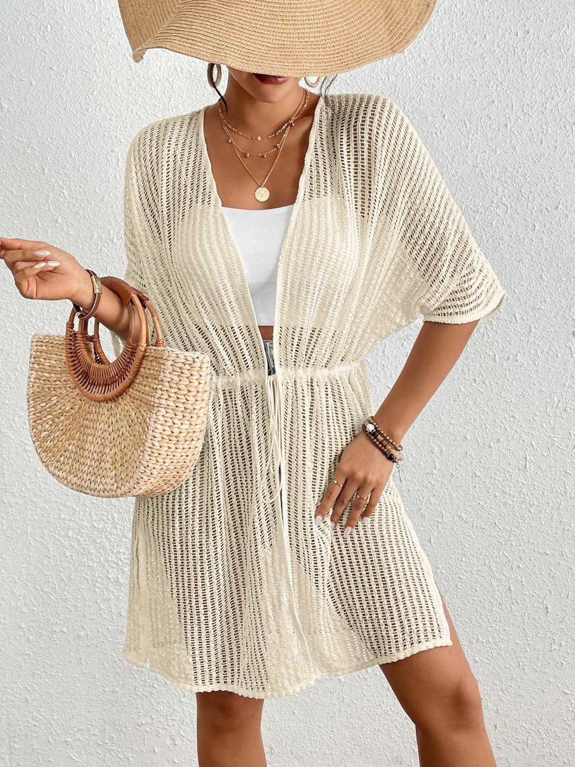 Bsubseach Crochet Kimonos for Women Mesh Sexy Bathing Suit Cover Ups Open Front Beach Summer Outwear(Beige)