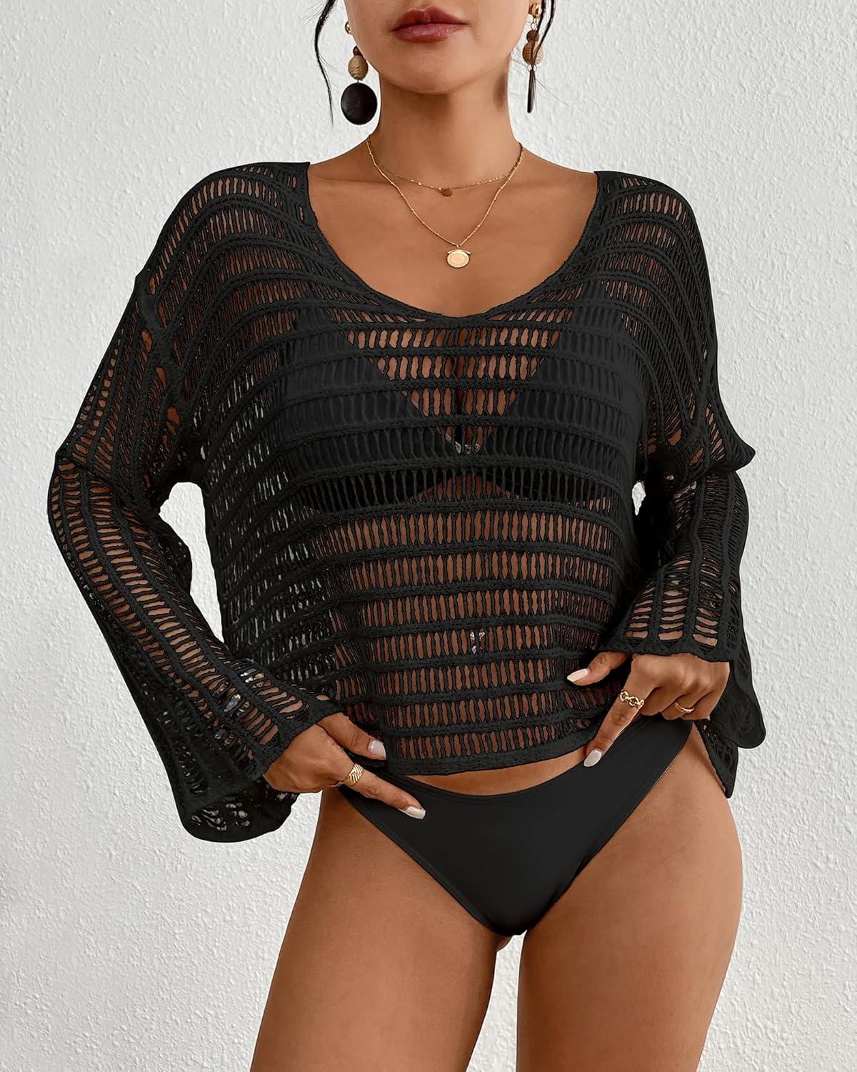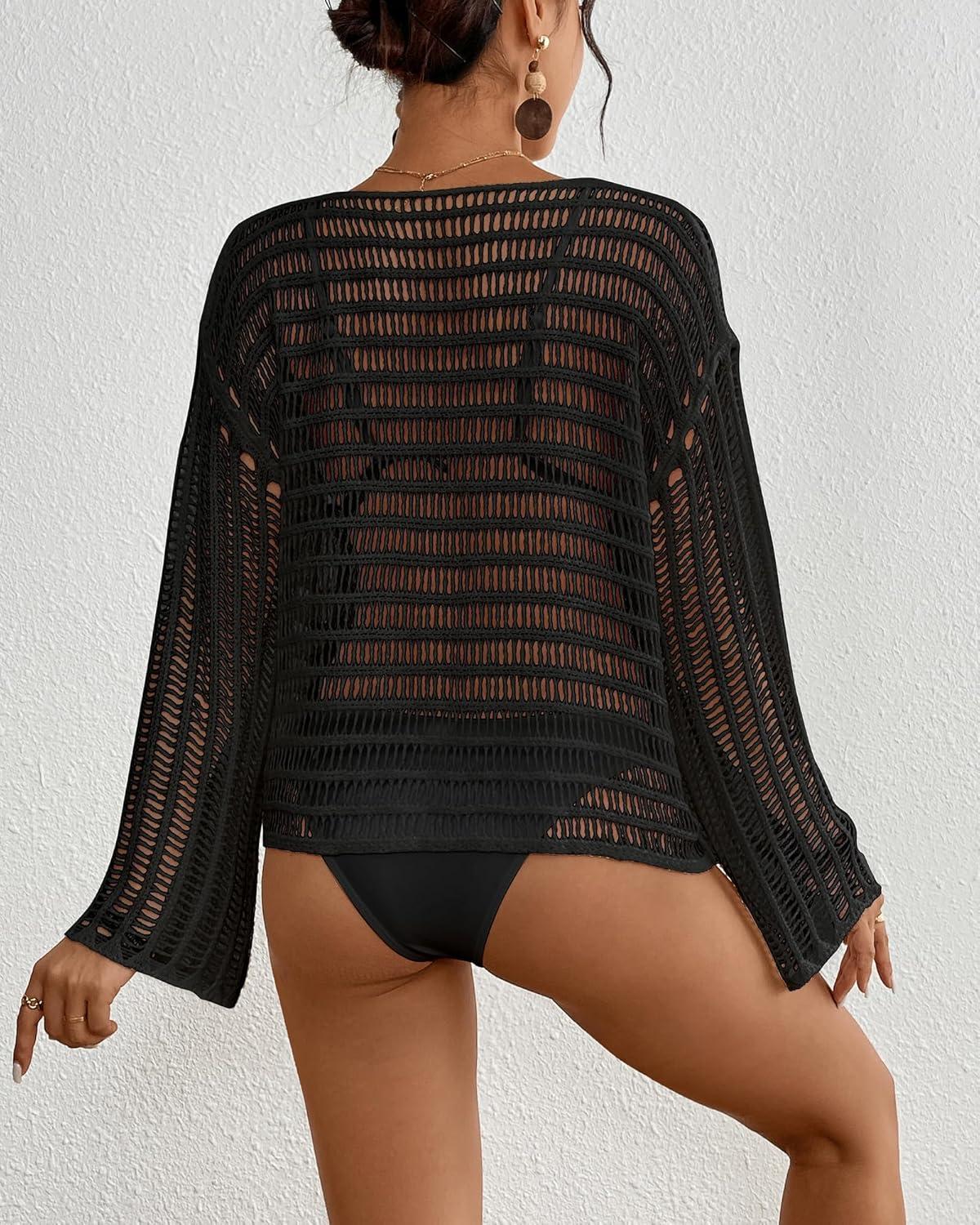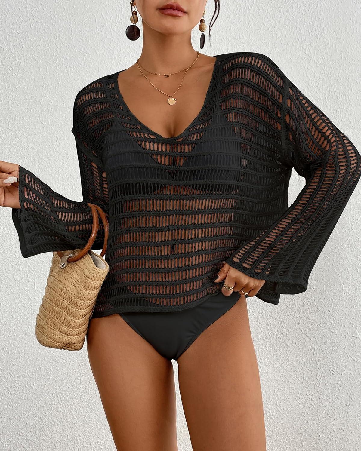 Bsubseach Crochet Tops for Women Long Sleeve Beach Swimsuit Coverup Mesh Knit Crop Top Bathing Suit Cover Up(Black)
