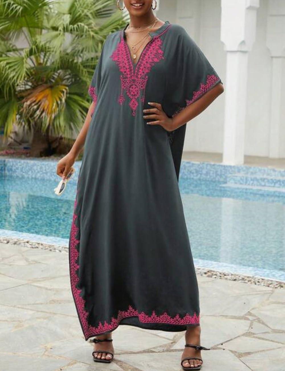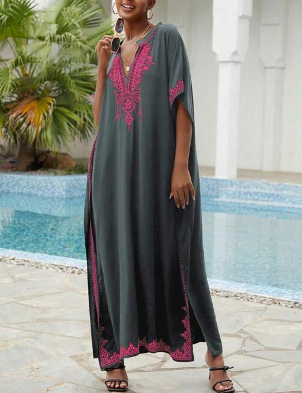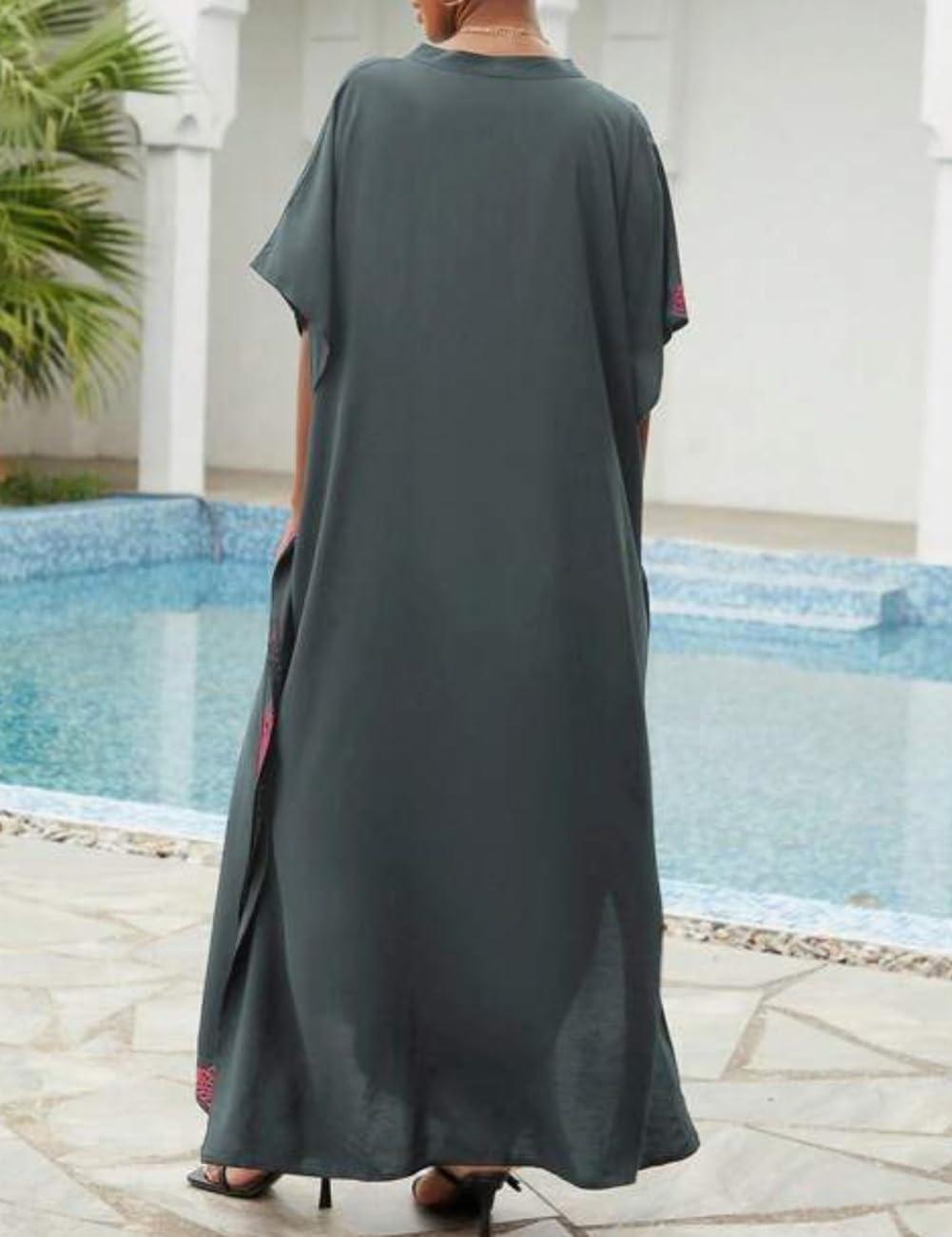 Bsubseach Kaftan Cover Ups for Swimwear Long Caftan Loungewear Gold Embroidery Swimsuit Cover Up Dress(Gray)