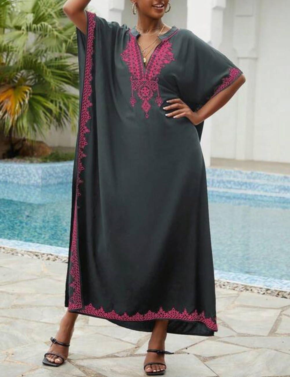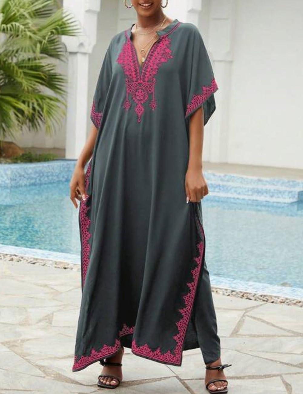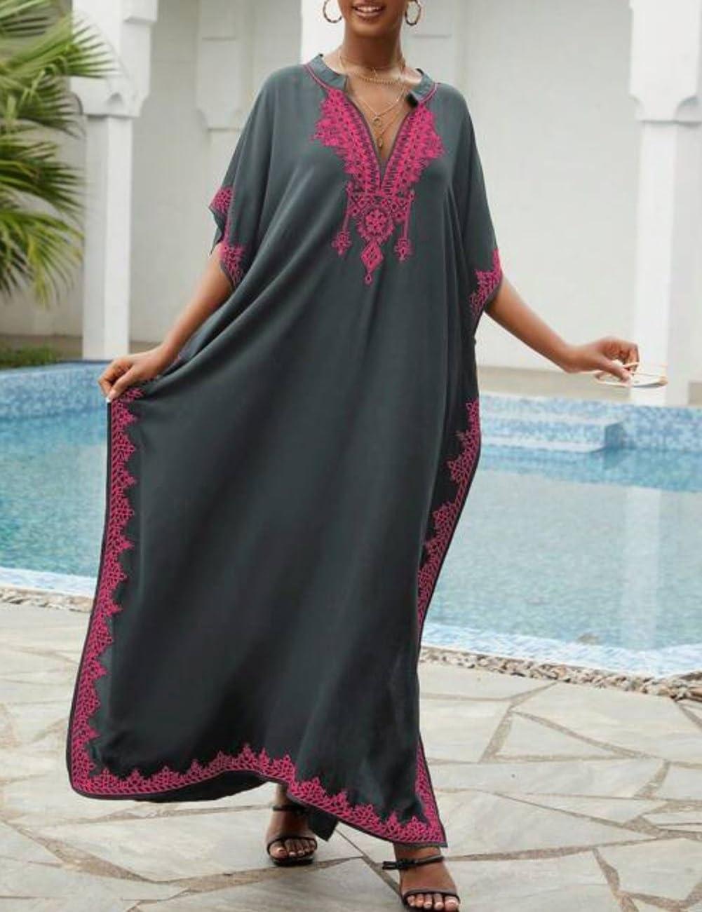 Bsubseach Kaftan Cover Ups for Swimwear Long Caftan Loungewear Gold Embroidery Swimsuit Cover Up Dress(Gray)