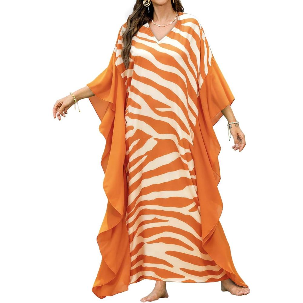 Bsubseach Kaftan Dresses for Women Plus Size Swimsuit Cover Ups Stripe Print Maxi Beach Caftan Moo Moos Dress(White Orange)