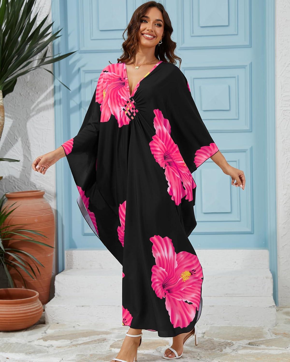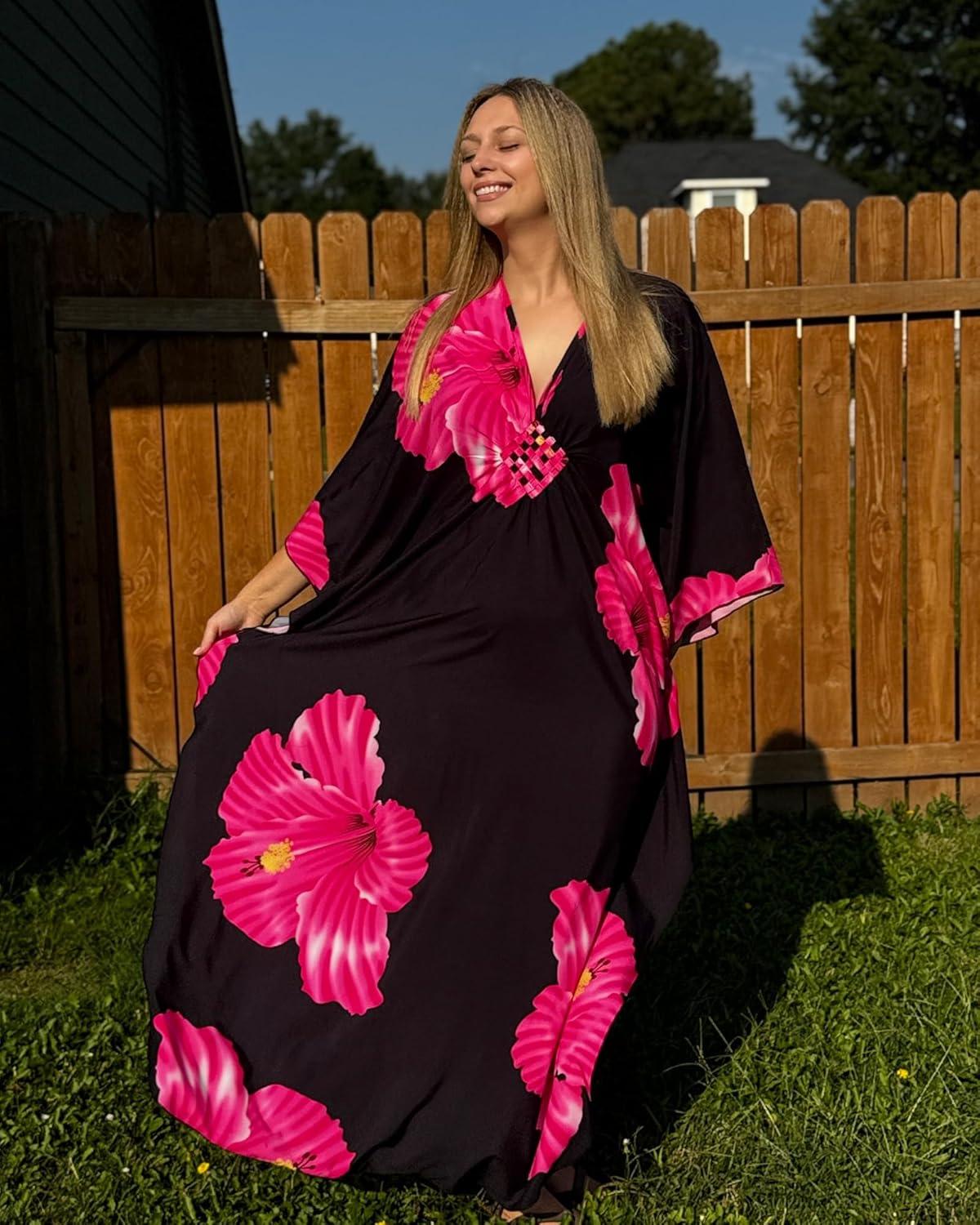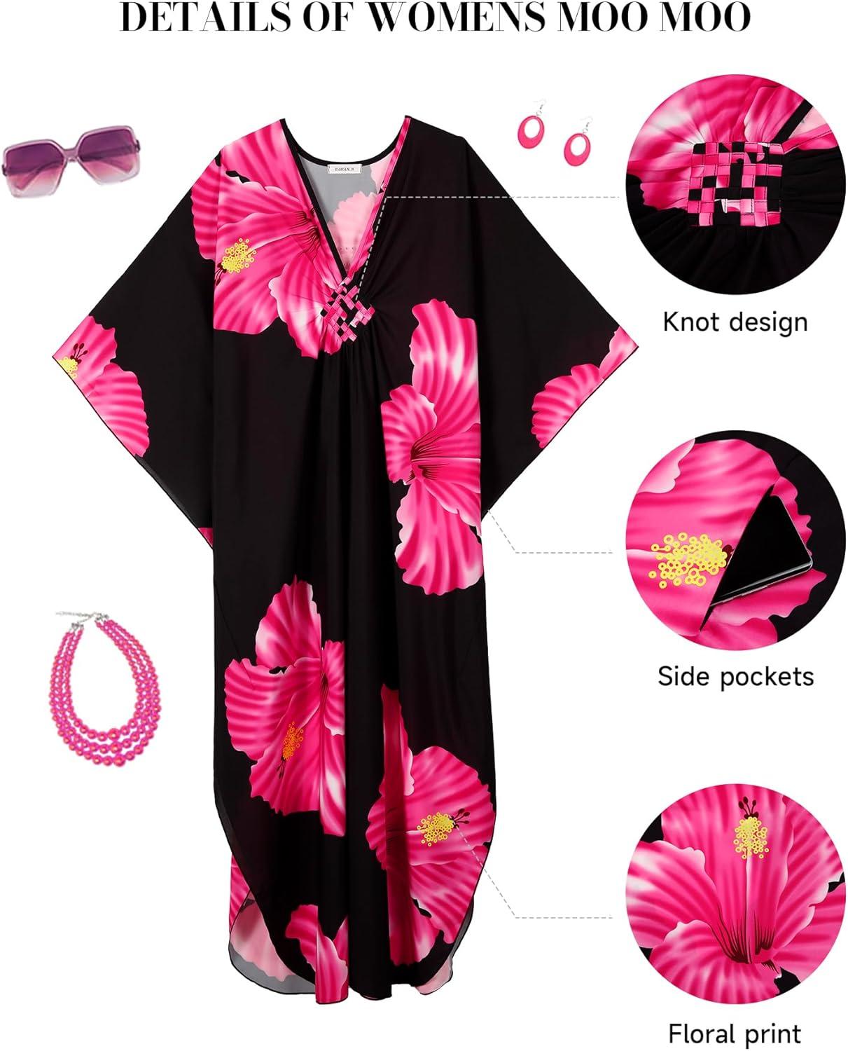 Bsubseach Moo Moos Kaftan Dresses for Women Floral Print Plus Size Swimsuit Coverup Caftan Maxi Beach Dress with Pockets(Pink)