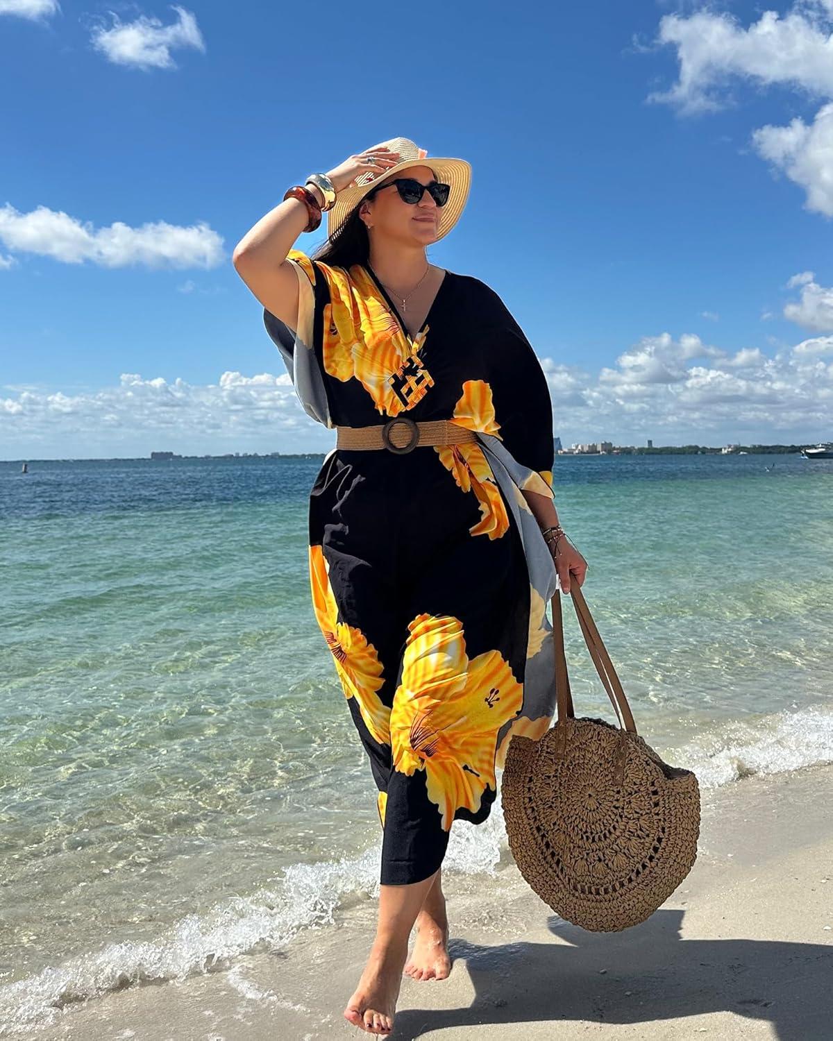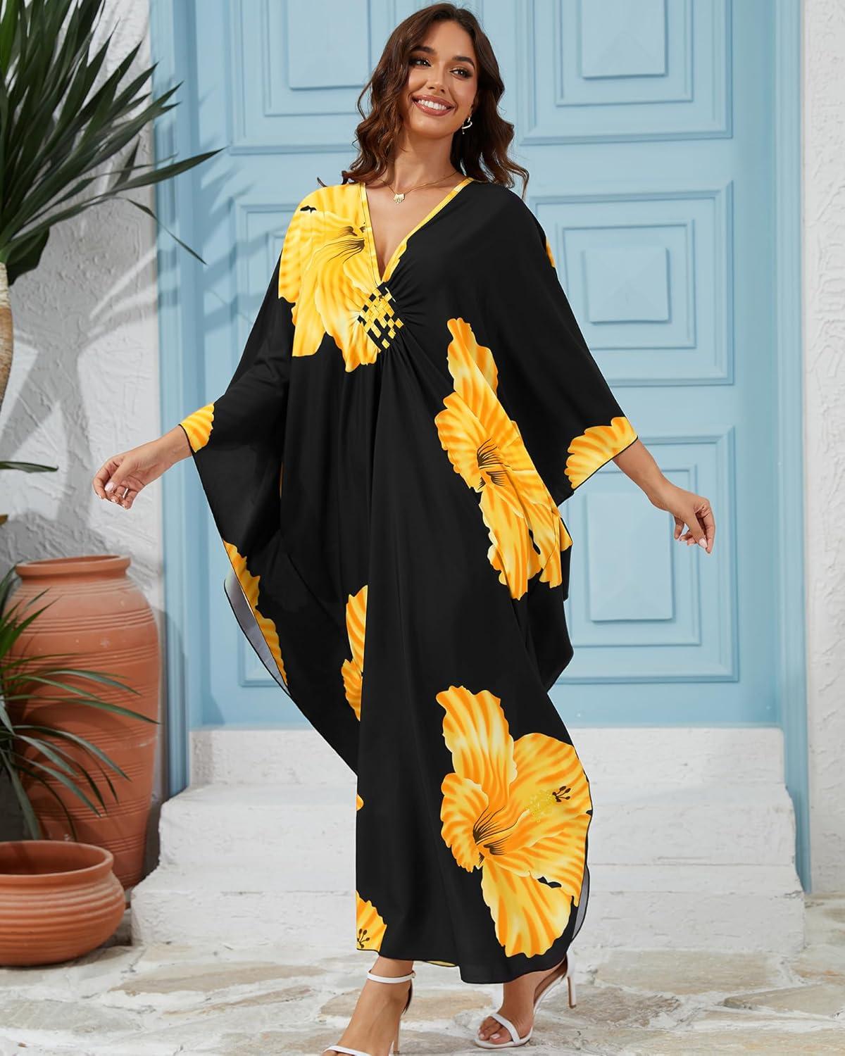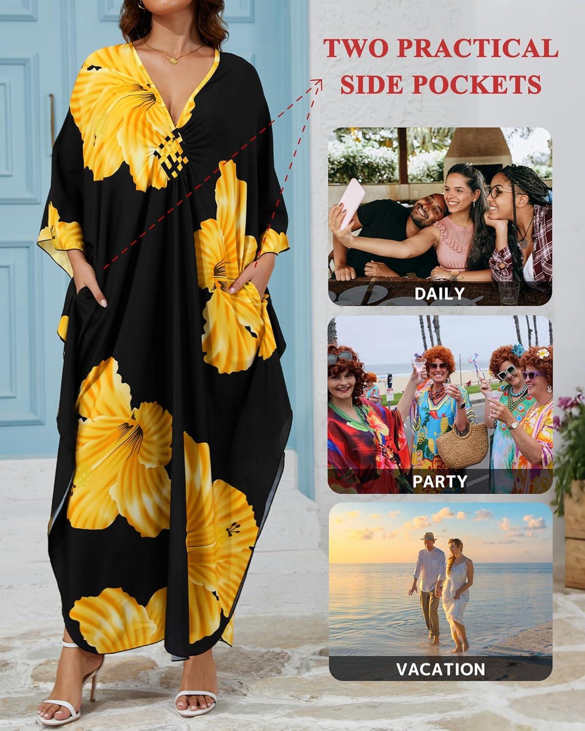 Bsubseach Moo Moos Kaftan Dresses for Women Floral Print Plus Size Swimsuit Coverup Caftan Maxi Beach Dress with Pockets(Yellow)