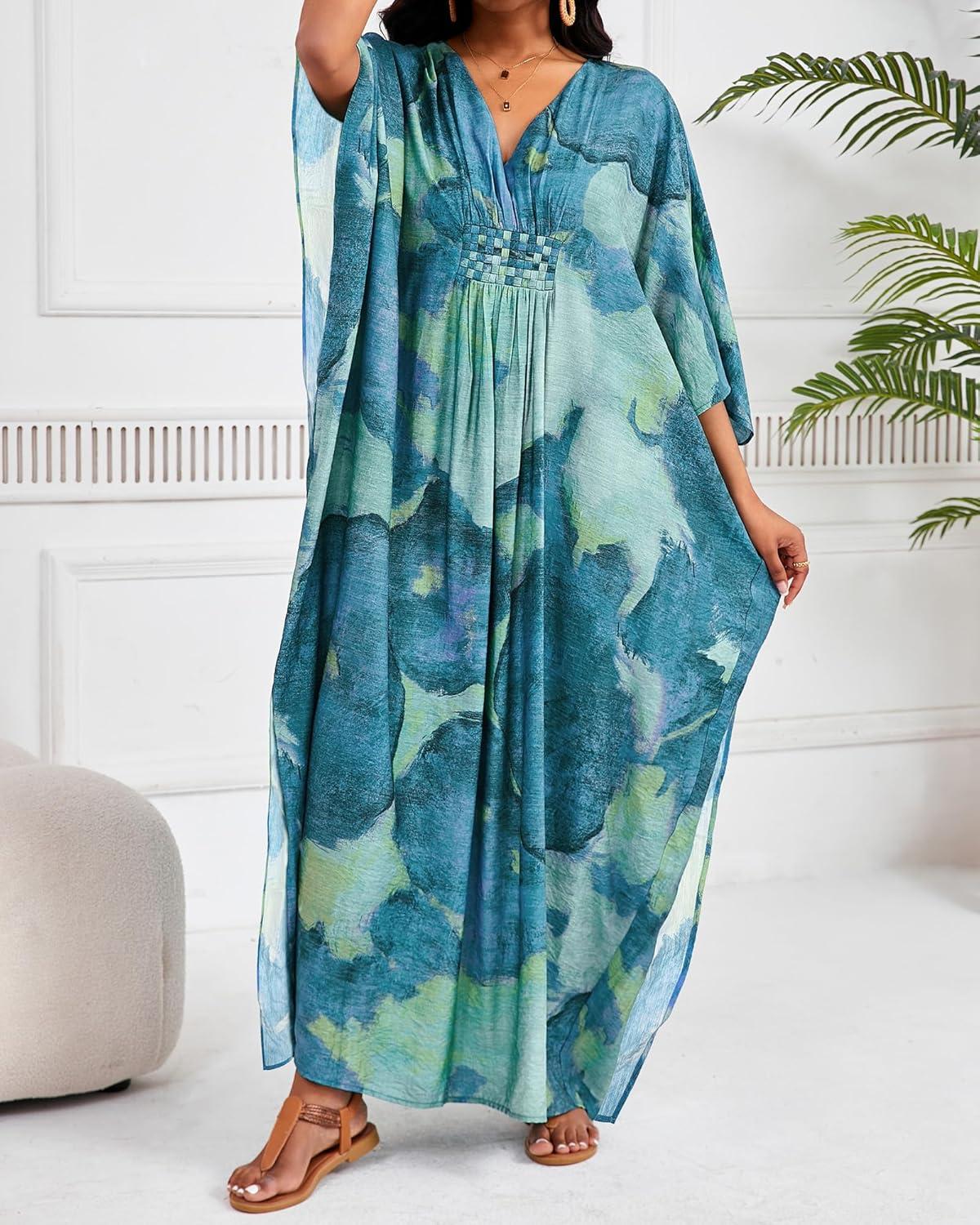 Bsubseach Plus Size Kaftan Dresses for Women V Neck Swimsuit Coverup Floral Print Caftan Maxi Beach Dress(Green)