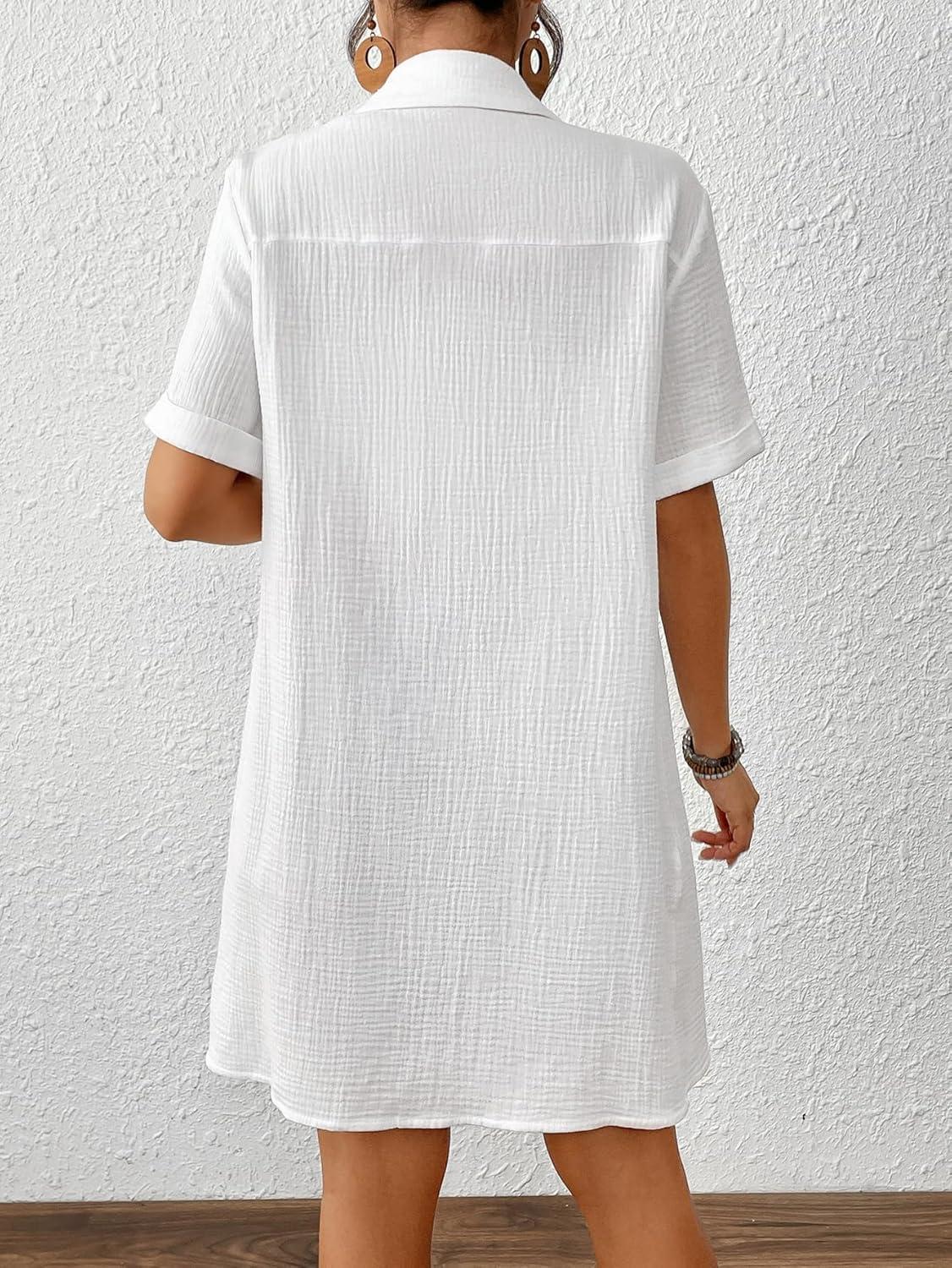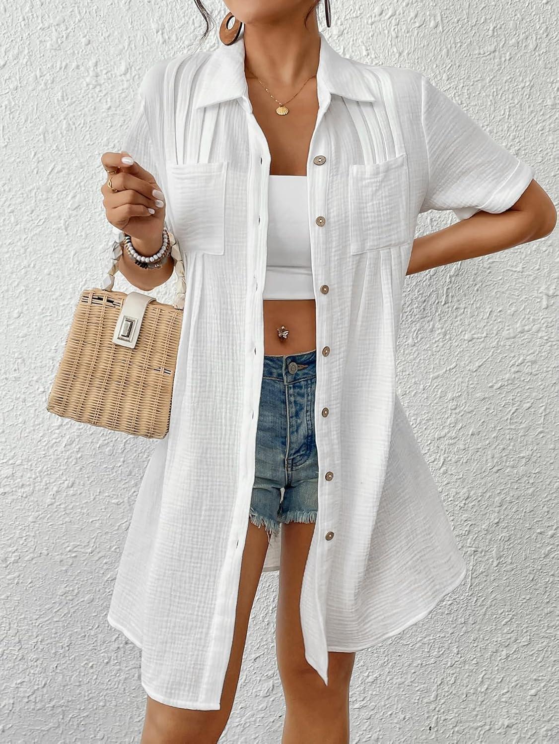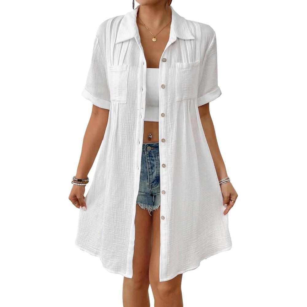 Bsubseach Swimsuit Cover Up for Women Short Sleeve Button Down Blouse Bathing Suit Cover Ups Cotton Beach Shirt Dress(White)