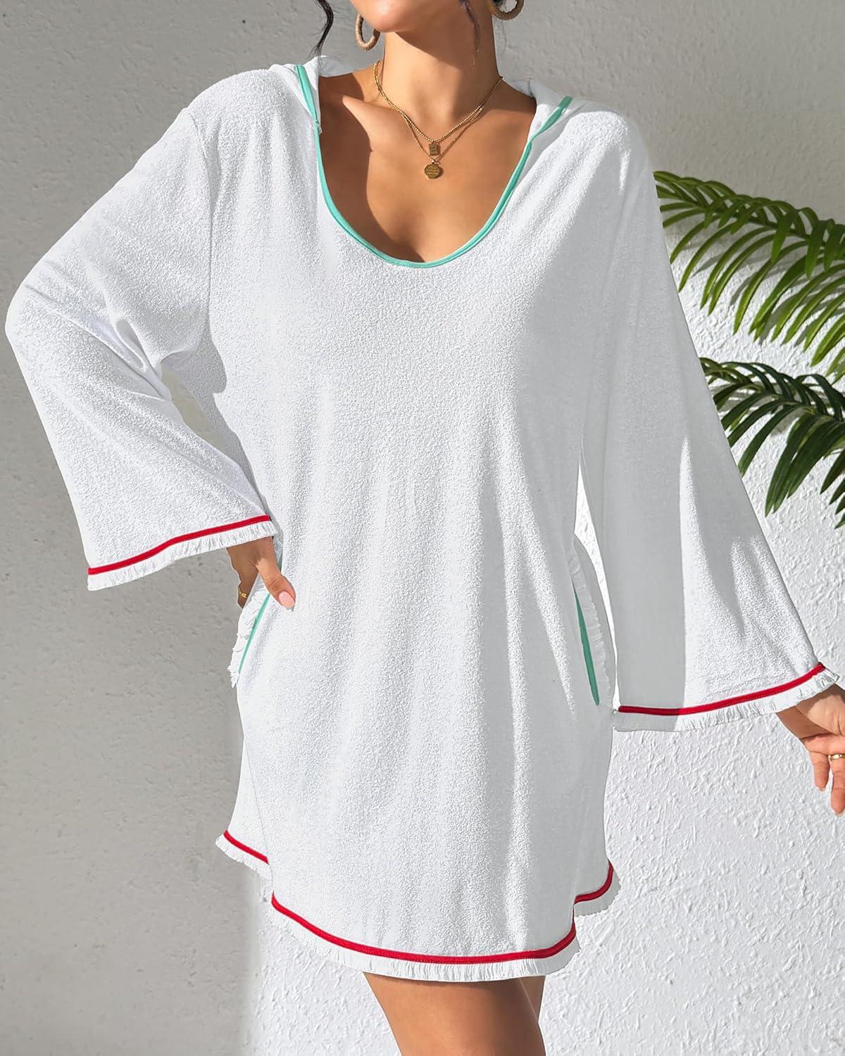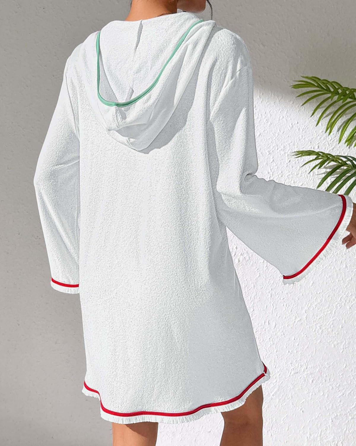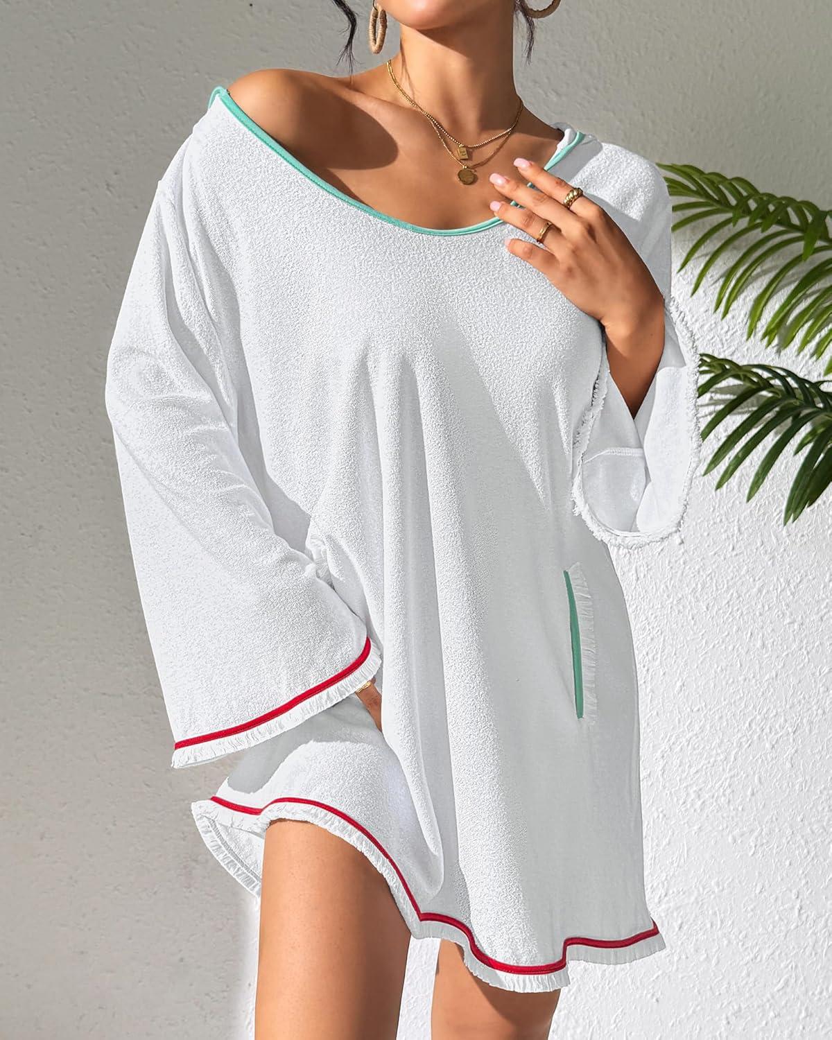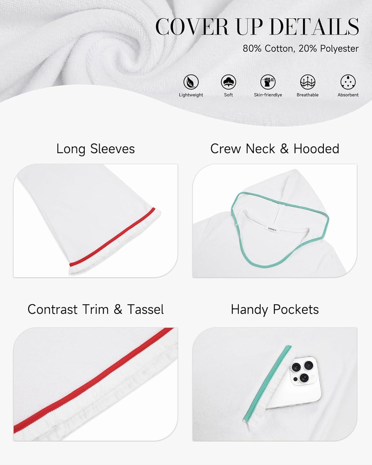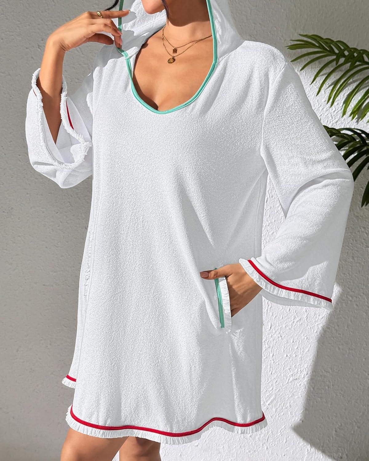 Bsubseach Terry Cloth Cover Up Women Long Sleeve Bathing Suit Coverup Oversized Hooded Towel Dress with Pockets(White)