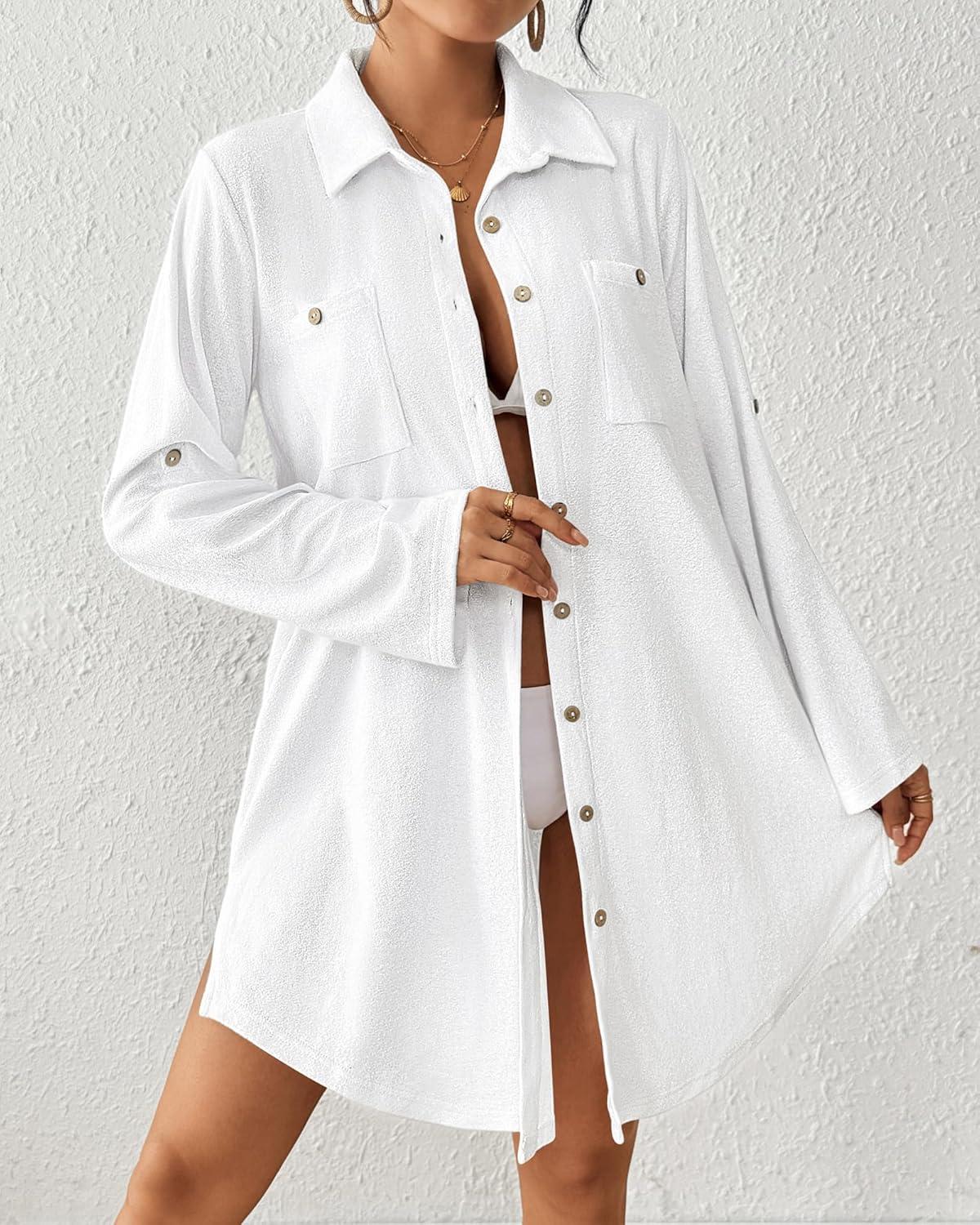 Bsubseach Terry Cloth Swim Cover Up for Women Cotton Bathing Suit Coverup Button Down Beach Shirt Robes with Pockets(White)