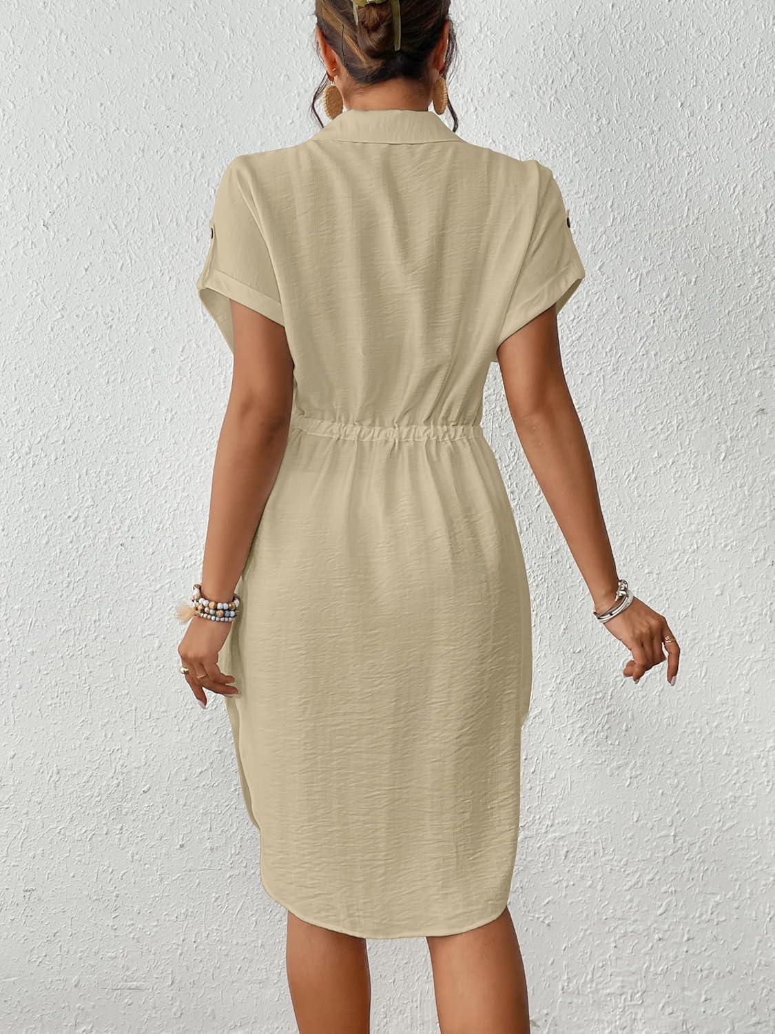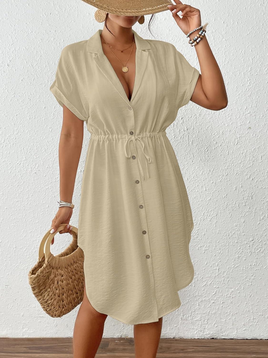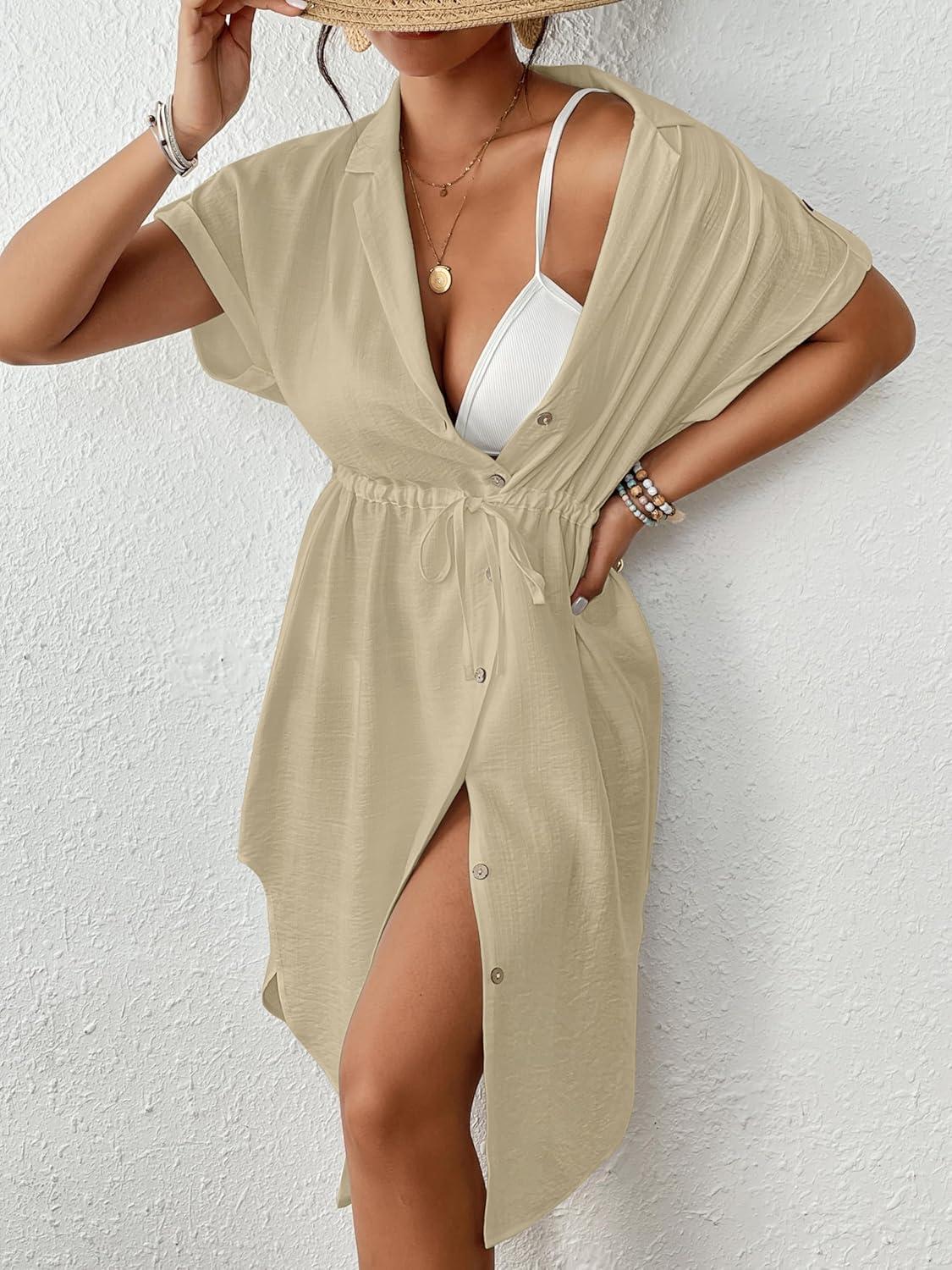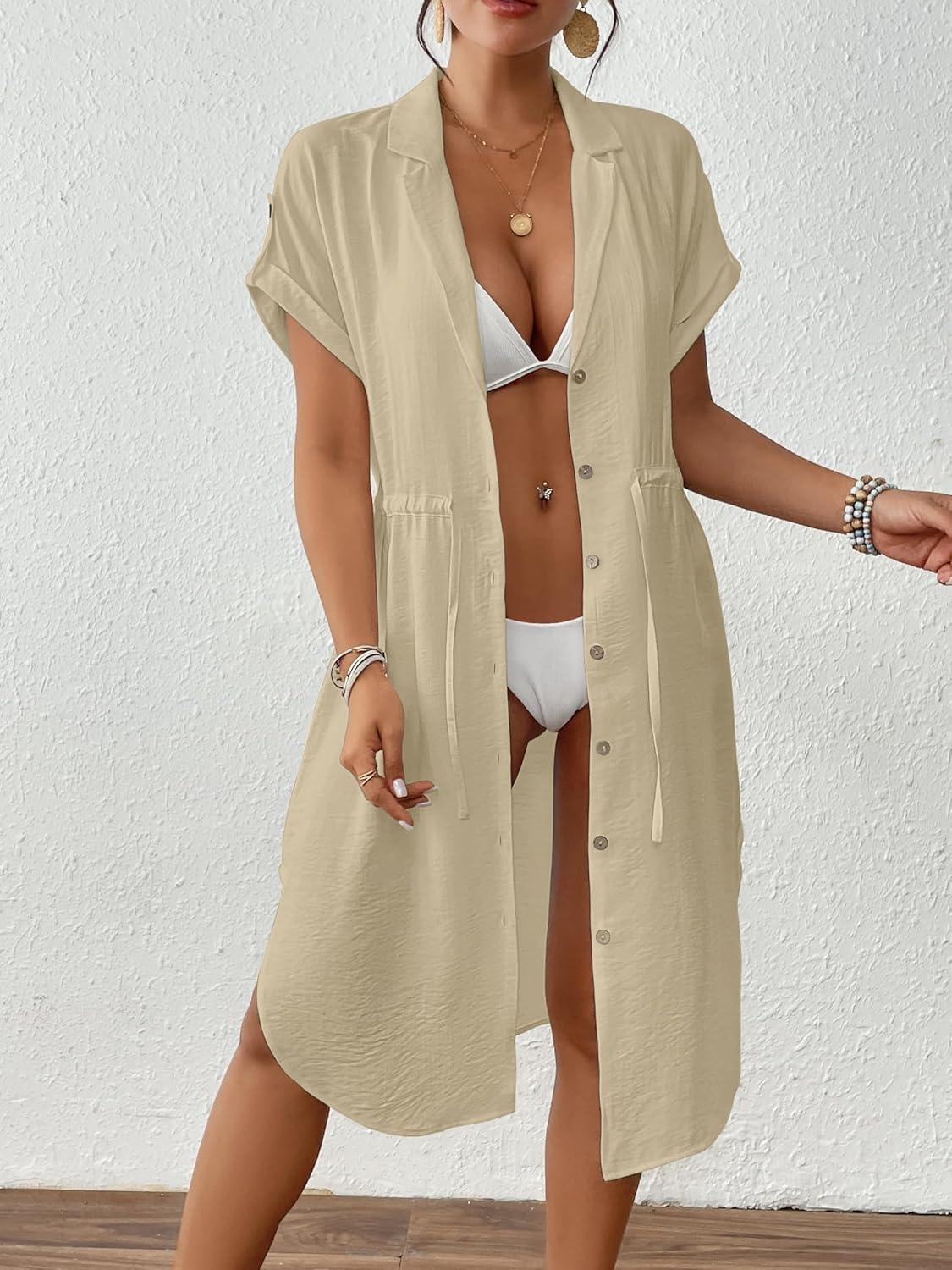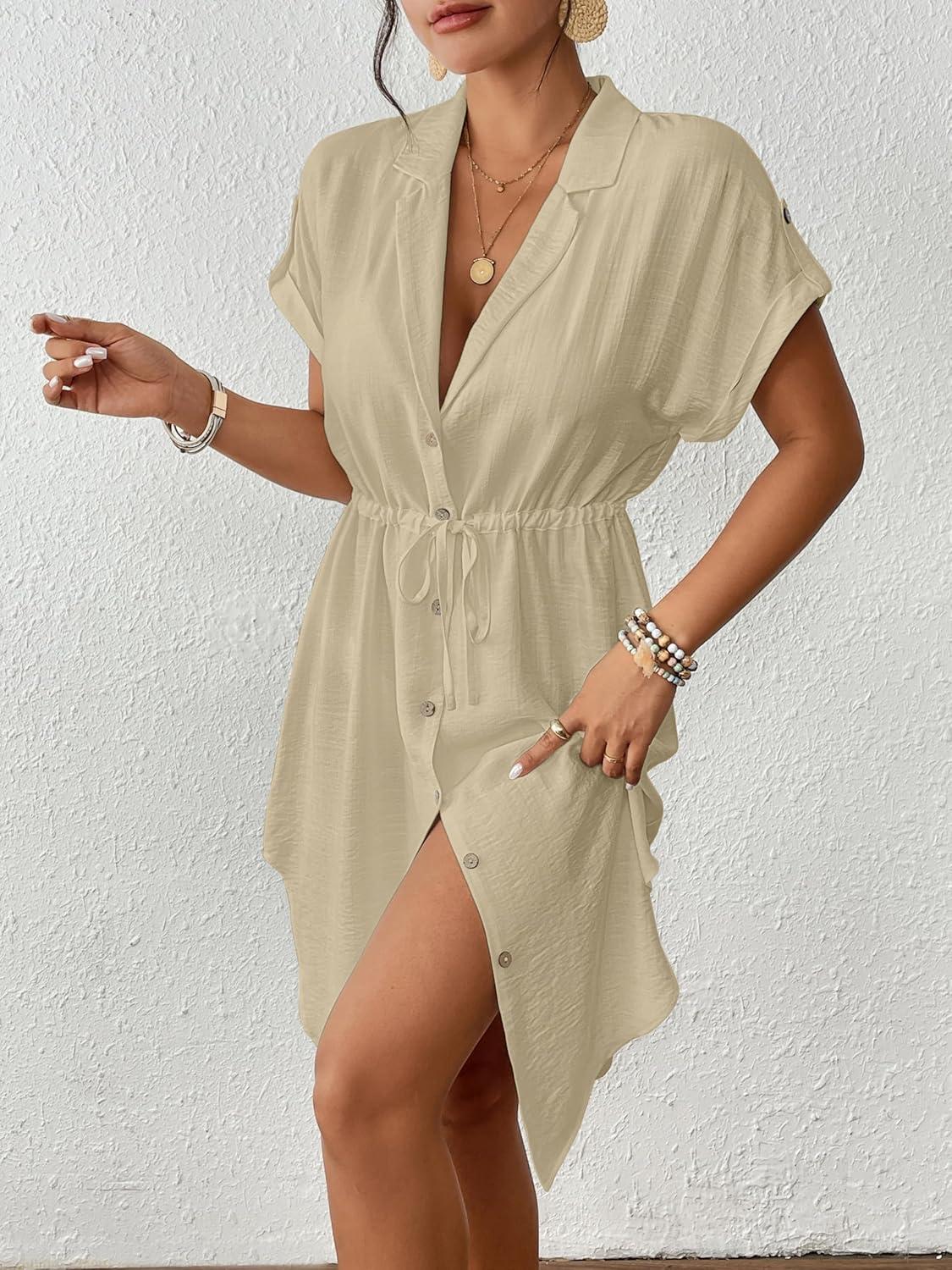 Bsubseach Women 2025 Swimsuit Coverup Button Bathing Suit Cover Ups Short Sleeve Shirt Cover Up Dress Beach Dress(Apricot)