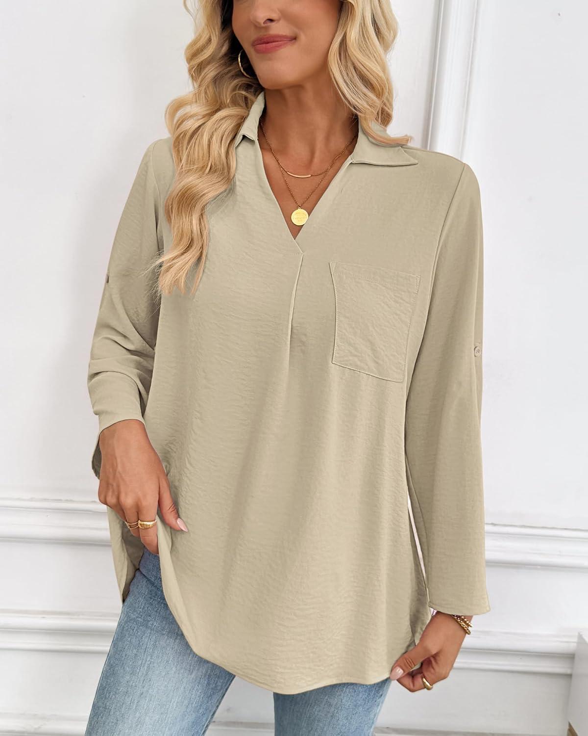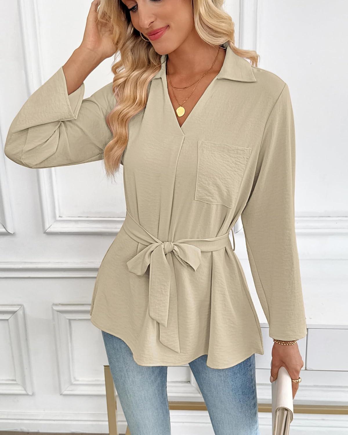 Bsubseach Women Dressy Casual Blouse Long Sleeve Work Shirts Wrap Belted V Neck Business Tops(Light Khaki)