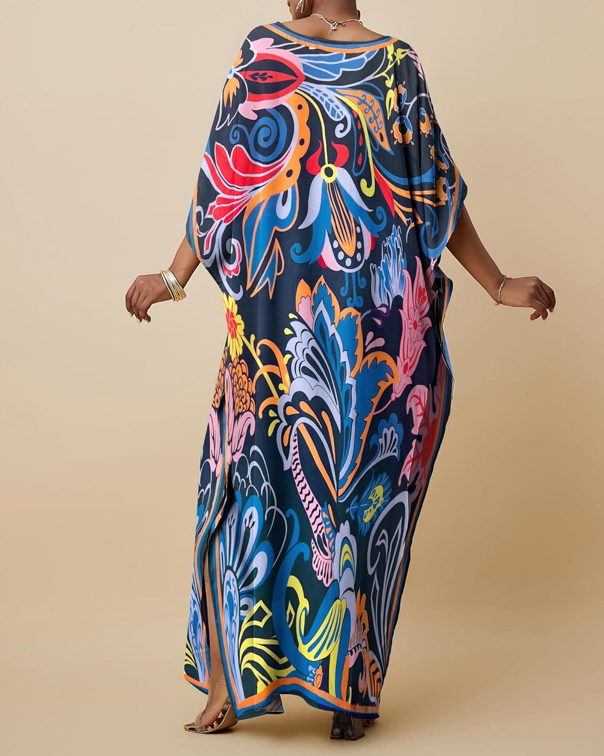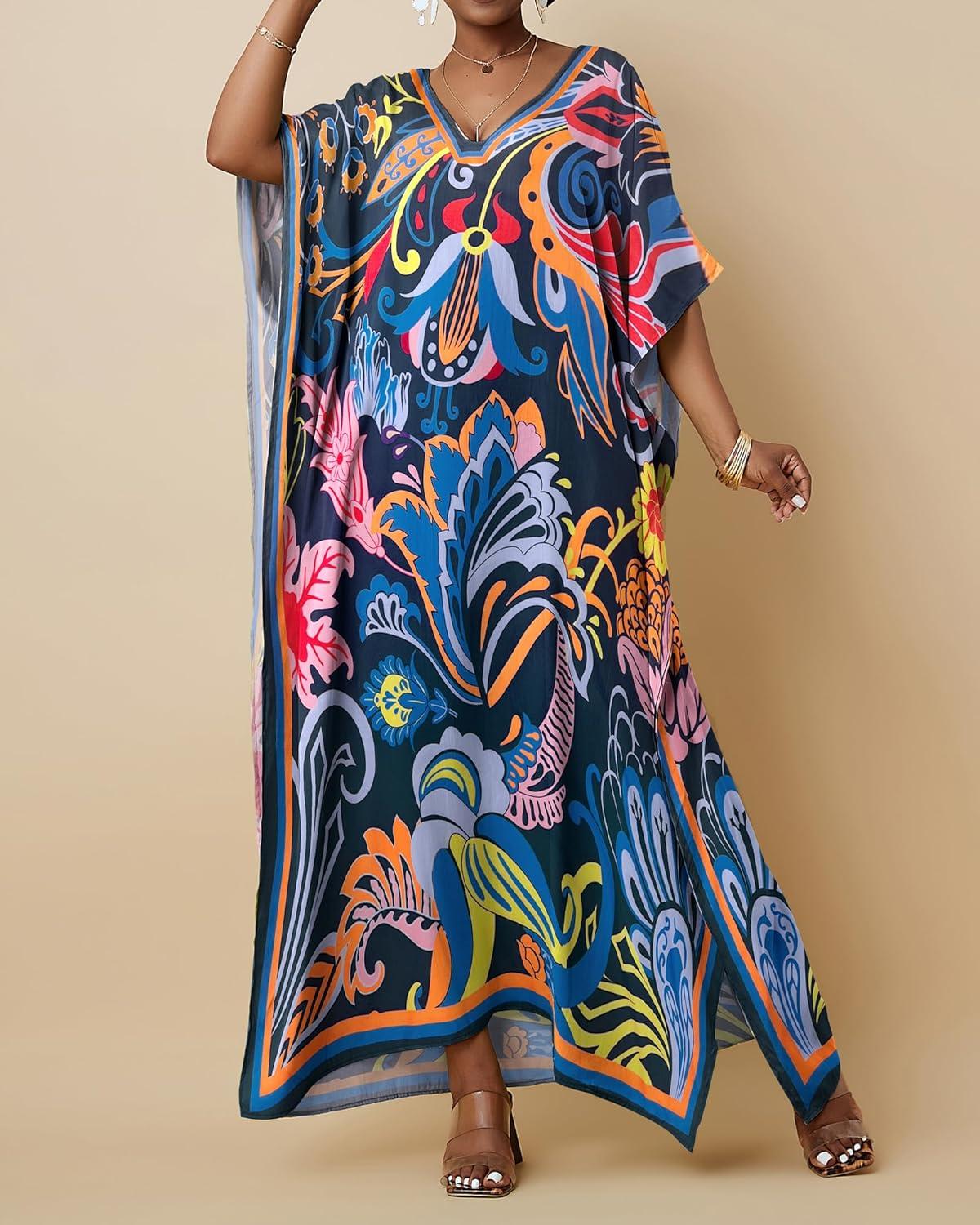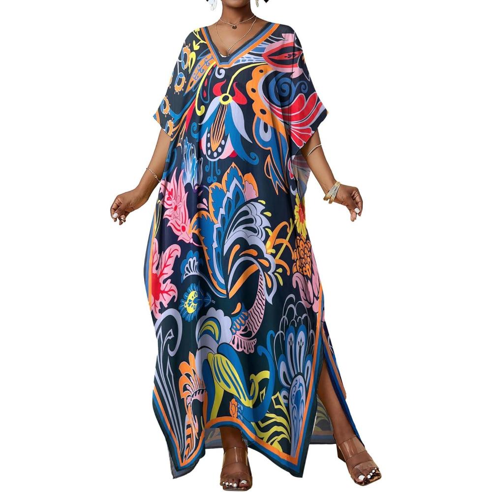 Bsubseach Women Kaftan Dresses Ethnic Print V-Neck Beach Cover Up Plus Size Caftan Loungewear Summer Swimsuit Coverup(Blue)