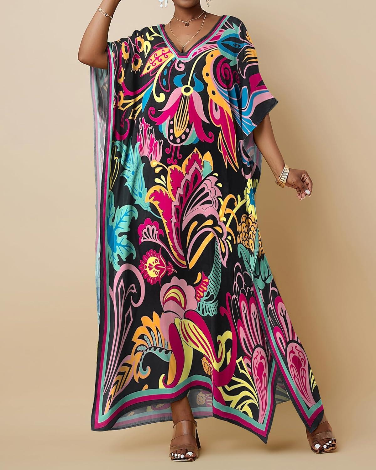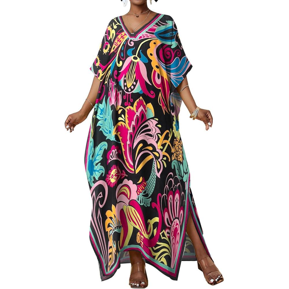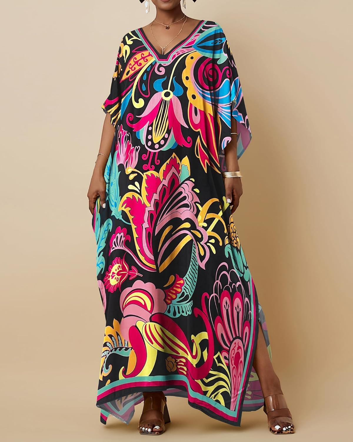 Bsubseach Women Kaftan Dresses Ethnic Print V-Neck Beach Cover Up Plus Size Caftan Loungewear Summer Swimsuit Coverup(Pink)