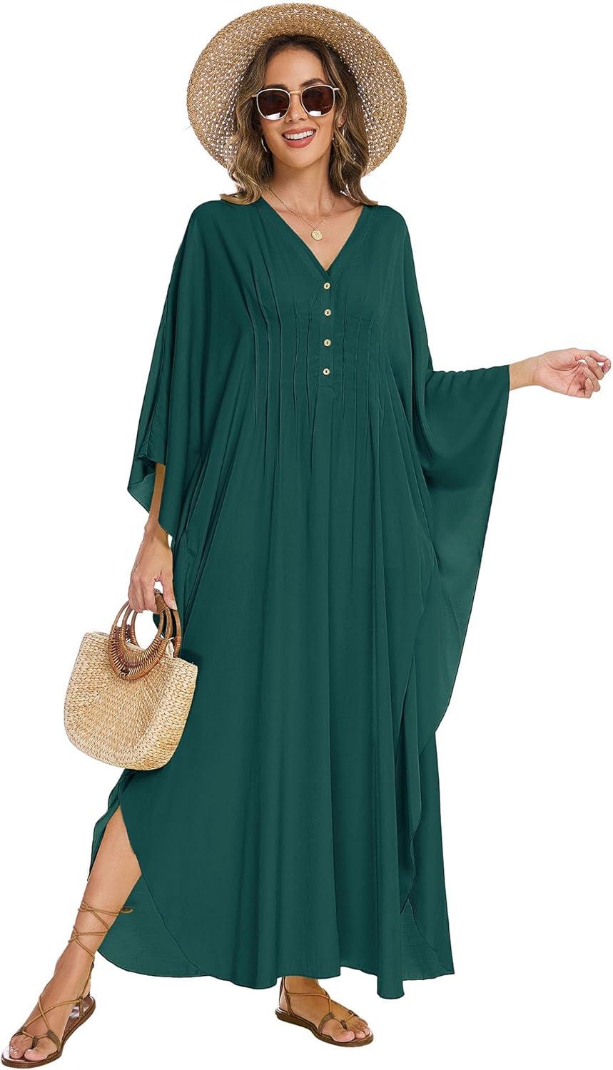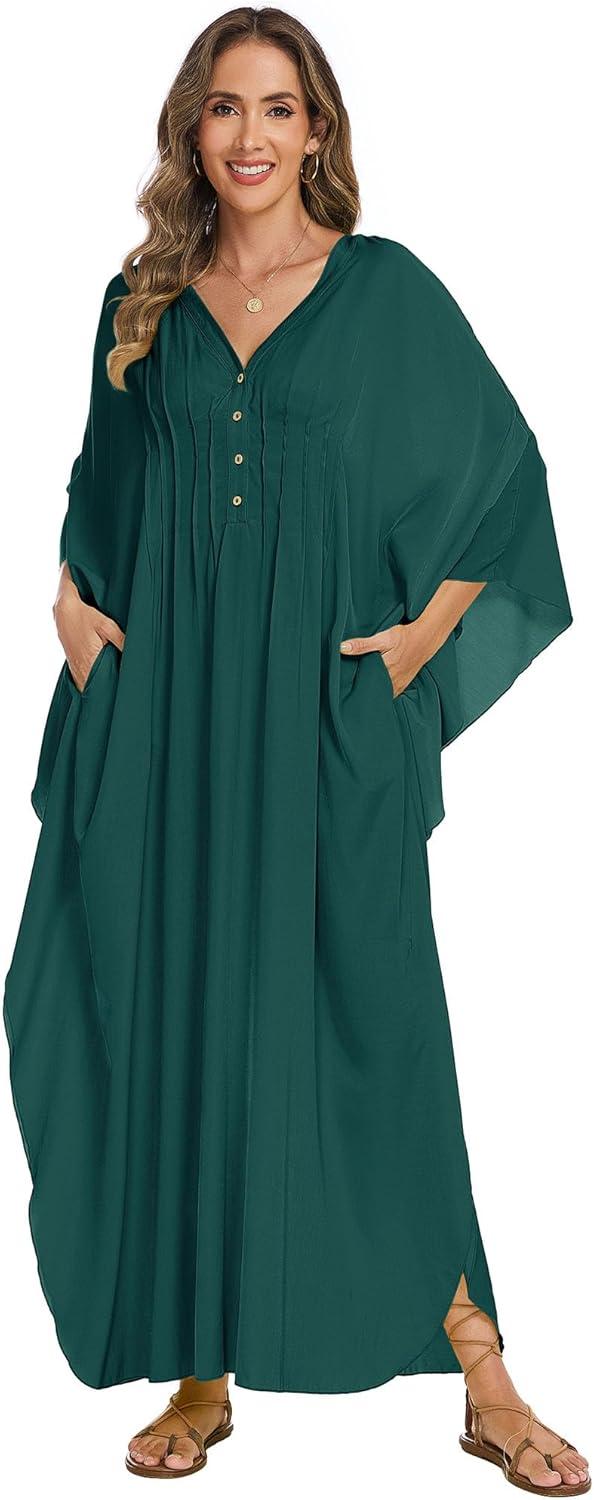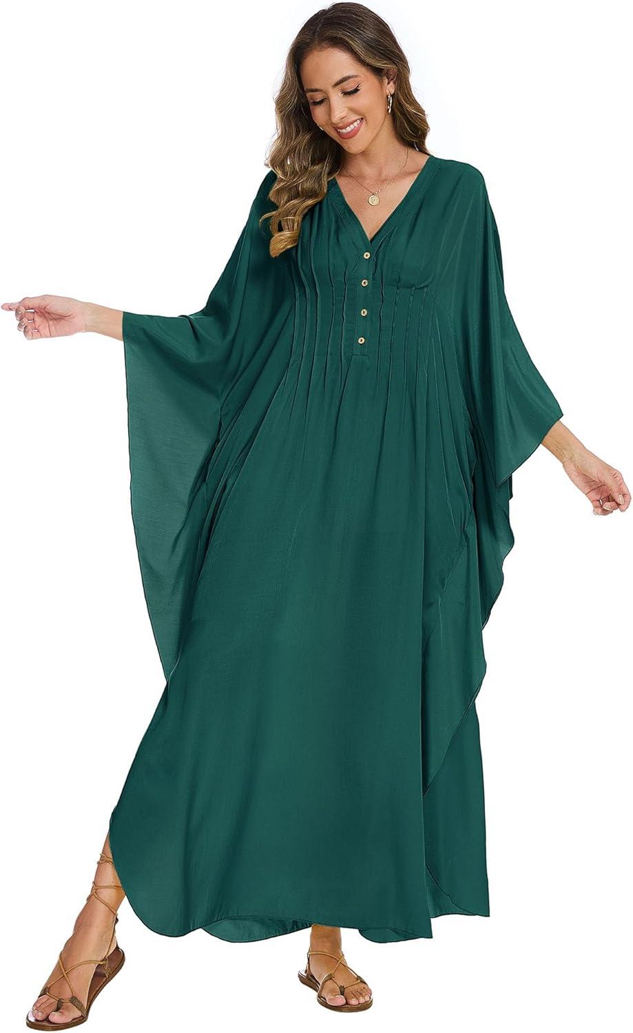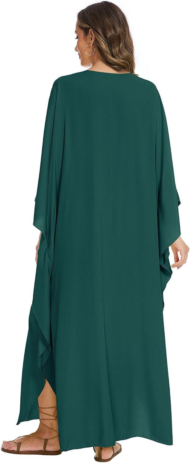 Bsubseach Women Kaftan Dresses Solid V Neck Swimsuit Coverup Batwing Sleeve Satin Plus Size Caftans with Pockets(Green)
