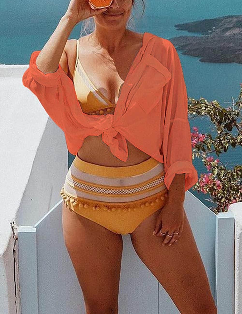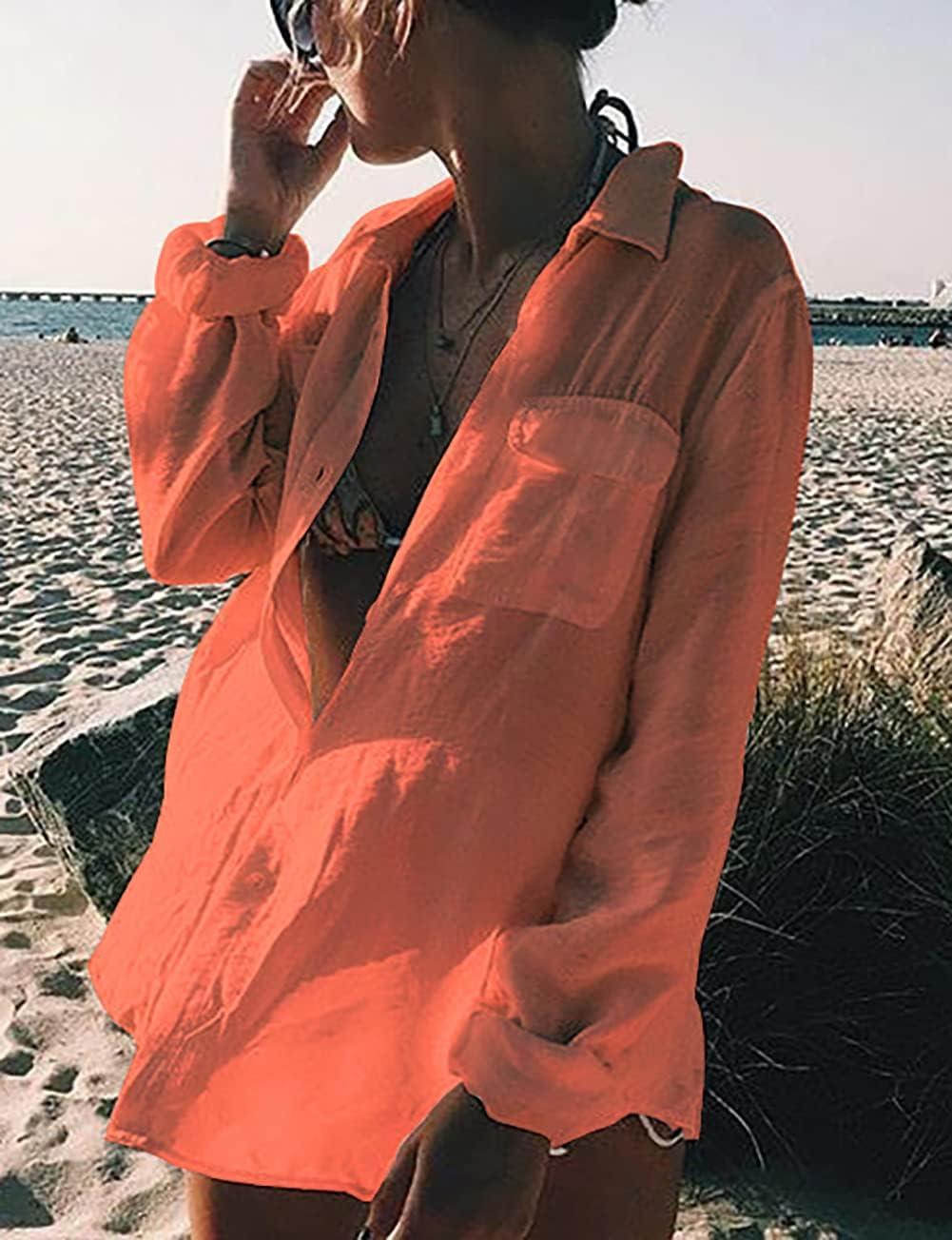 Bsubseach Women Long Sleeve Beach Shirt Blouses Bathing Suit Cover Up Button Down Collar(G-orange)