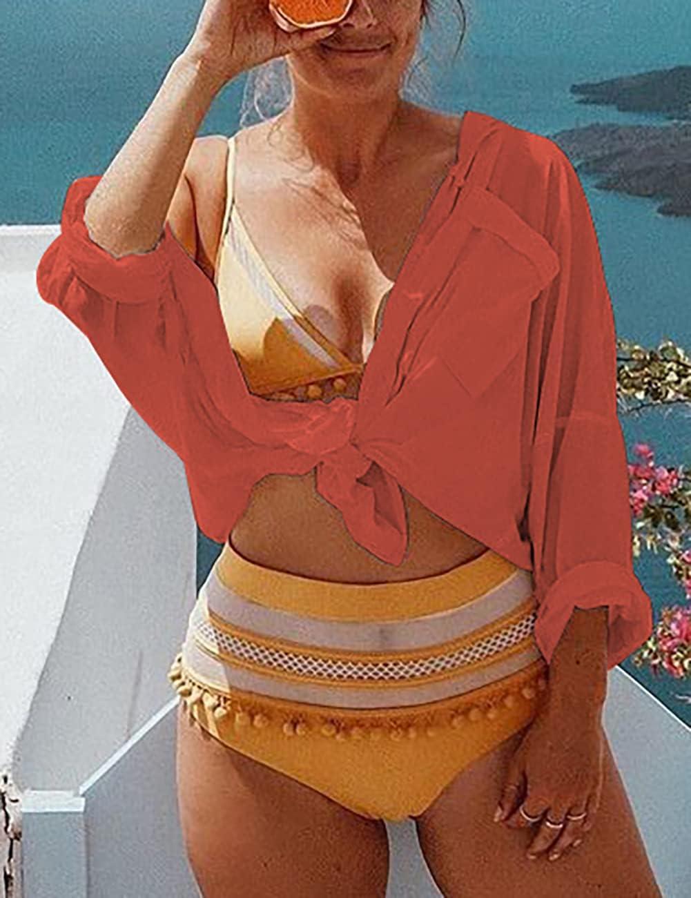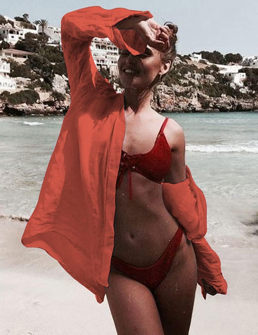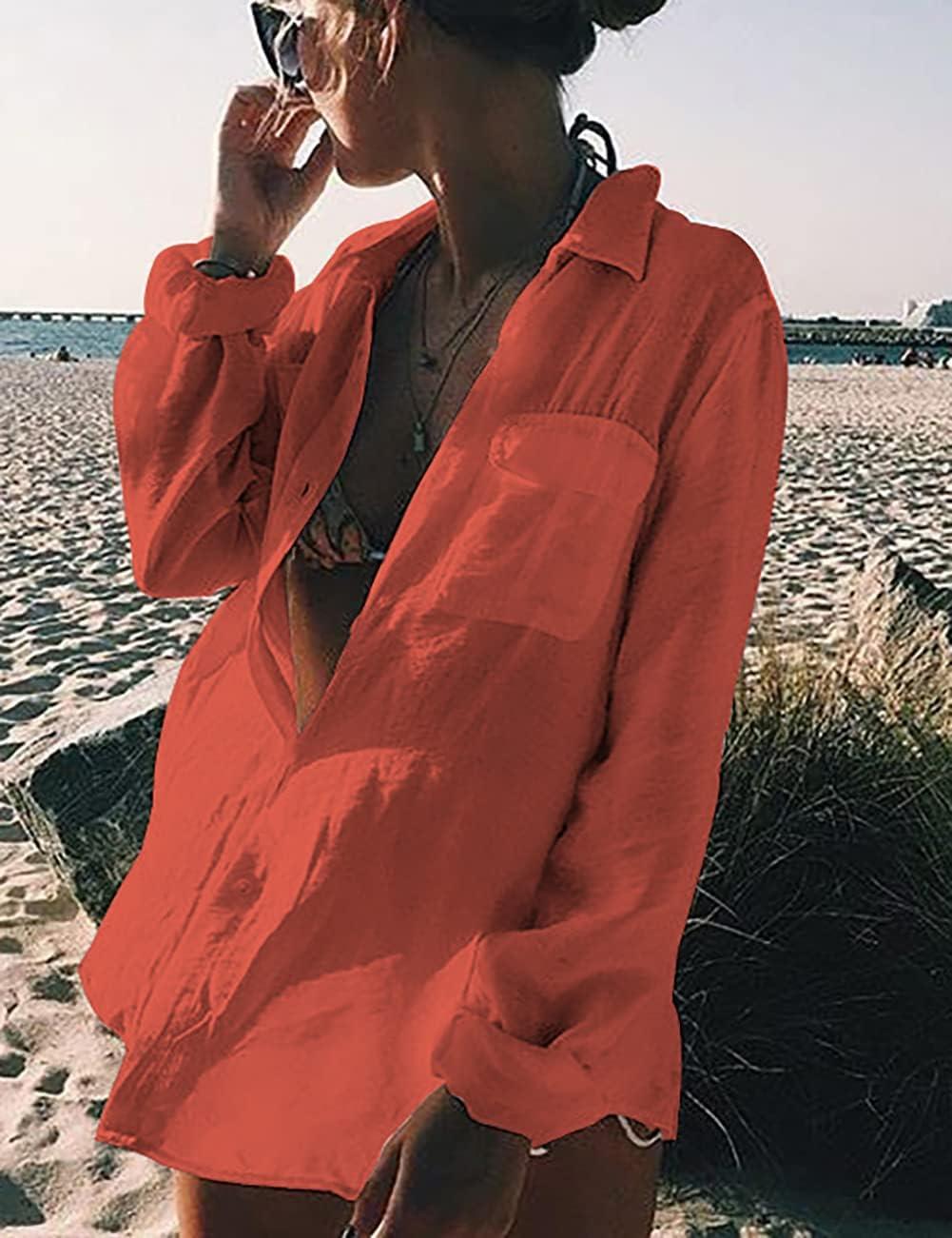 Bsubseach Women Long Sleeve Beach Shirt Blouses Bathing Suit Cover Up Button Down Collar(G-rust)