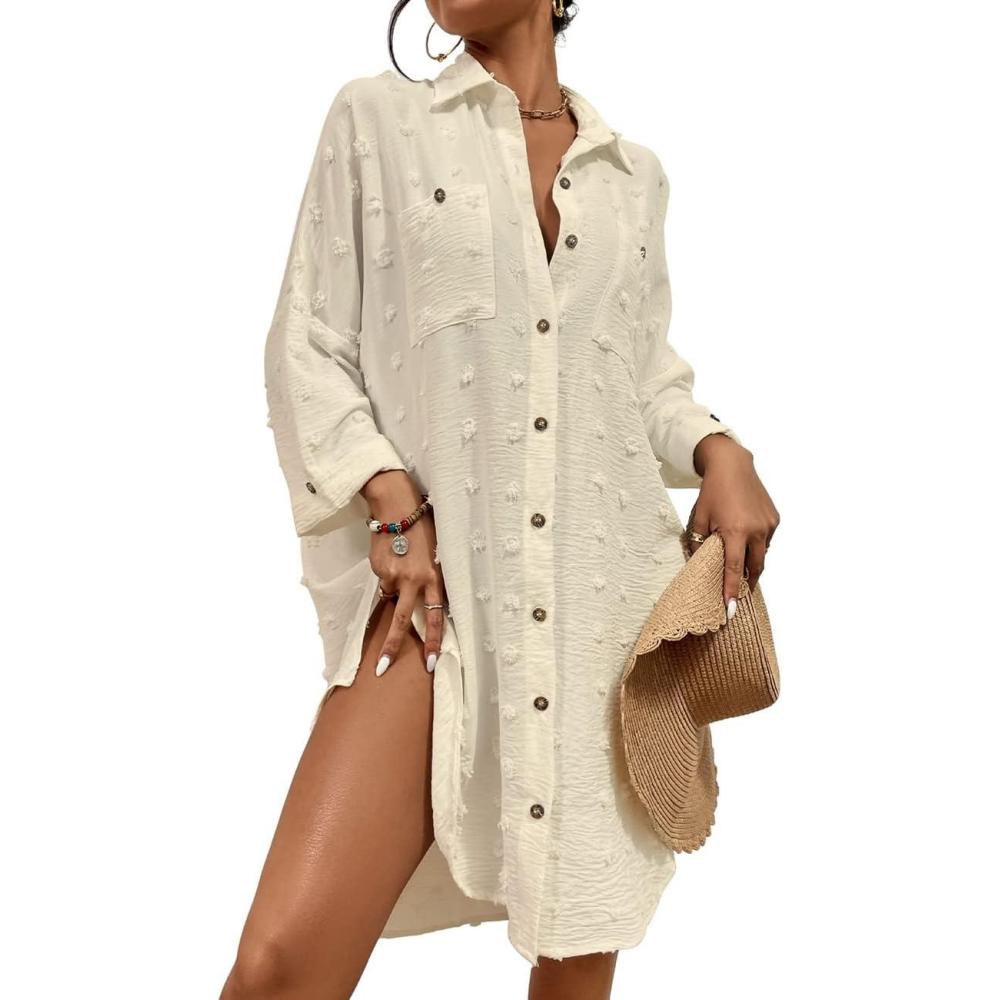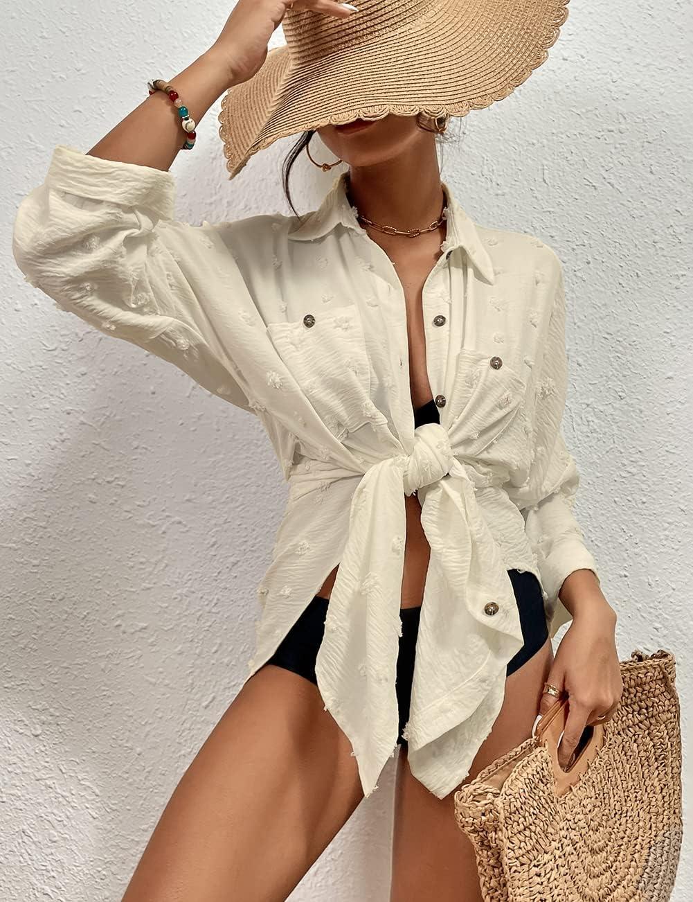 Bsubseach Women Swimsuit Coverup Blouse Button Down Shirt Dresses Swiss Dot Tops