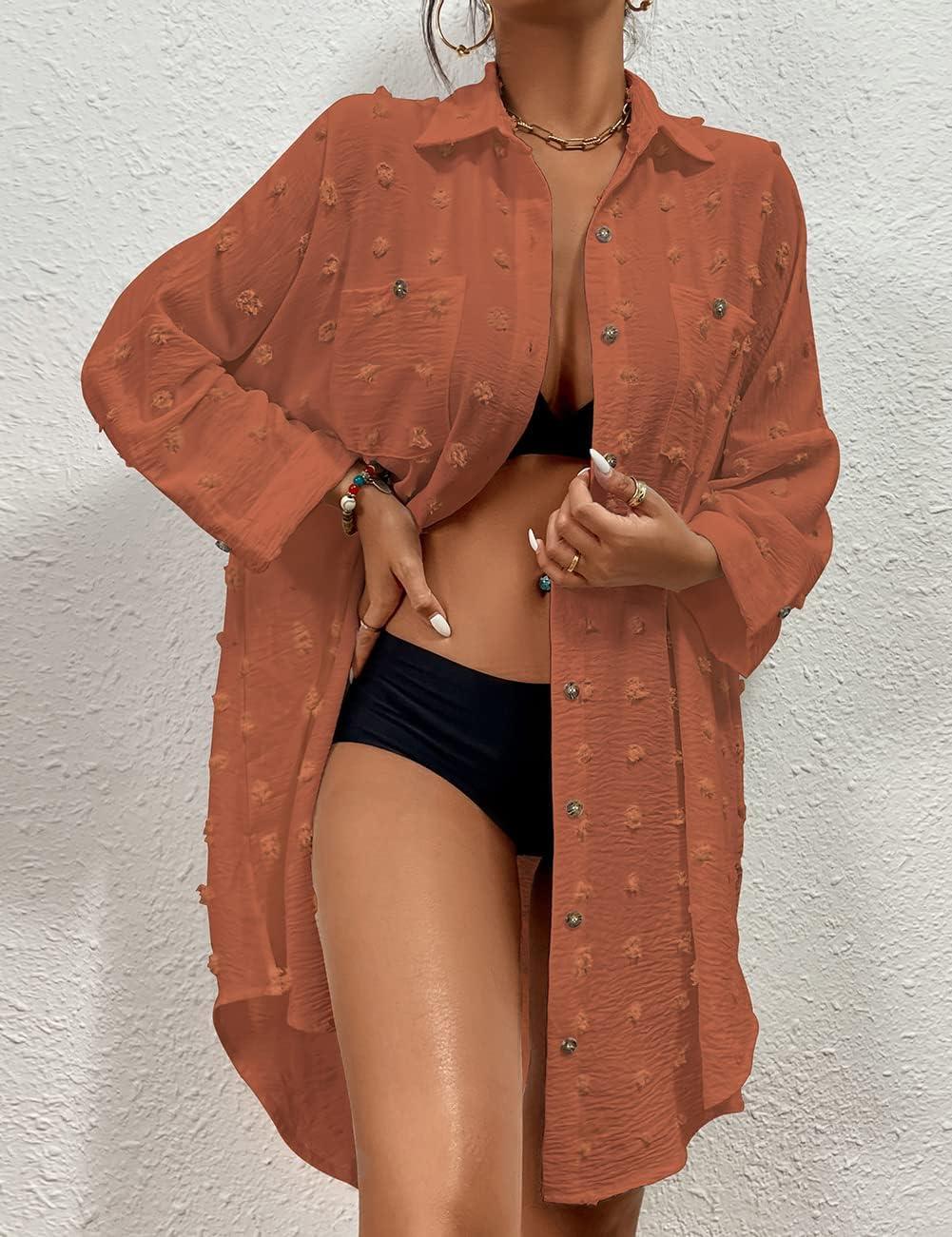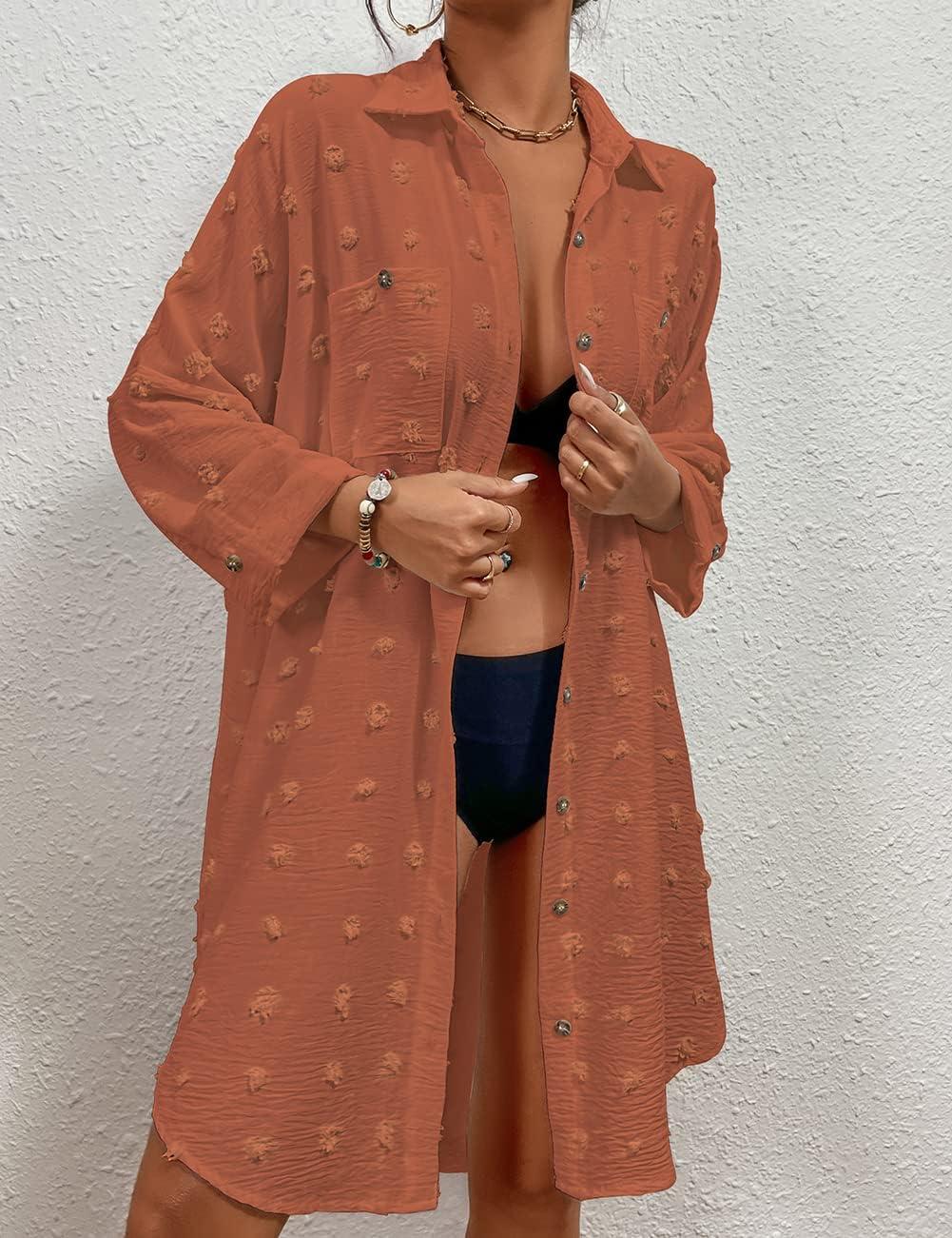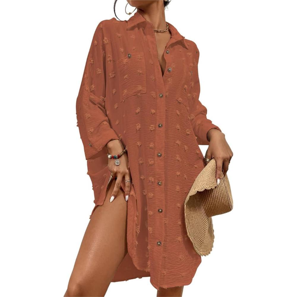 Bsubseach Women Swimsuit Coverup Blouse Button Down Shirt Dresses Swiss Dot Tops(J-brick Red)