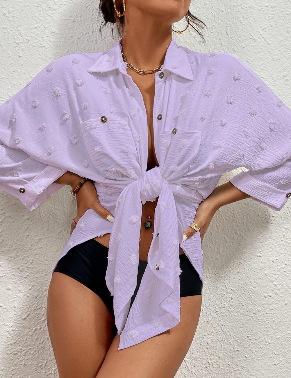 Bsubseach Women Swimsuit Coverup Blouse Button Down Shirt Dresses Swiss Dot Tops(J-light Purple)