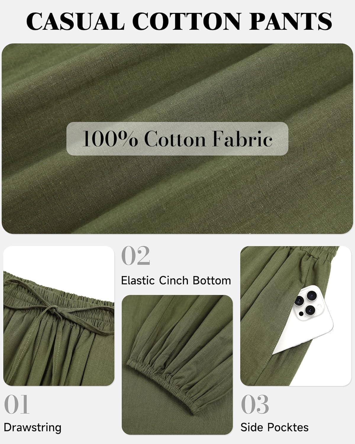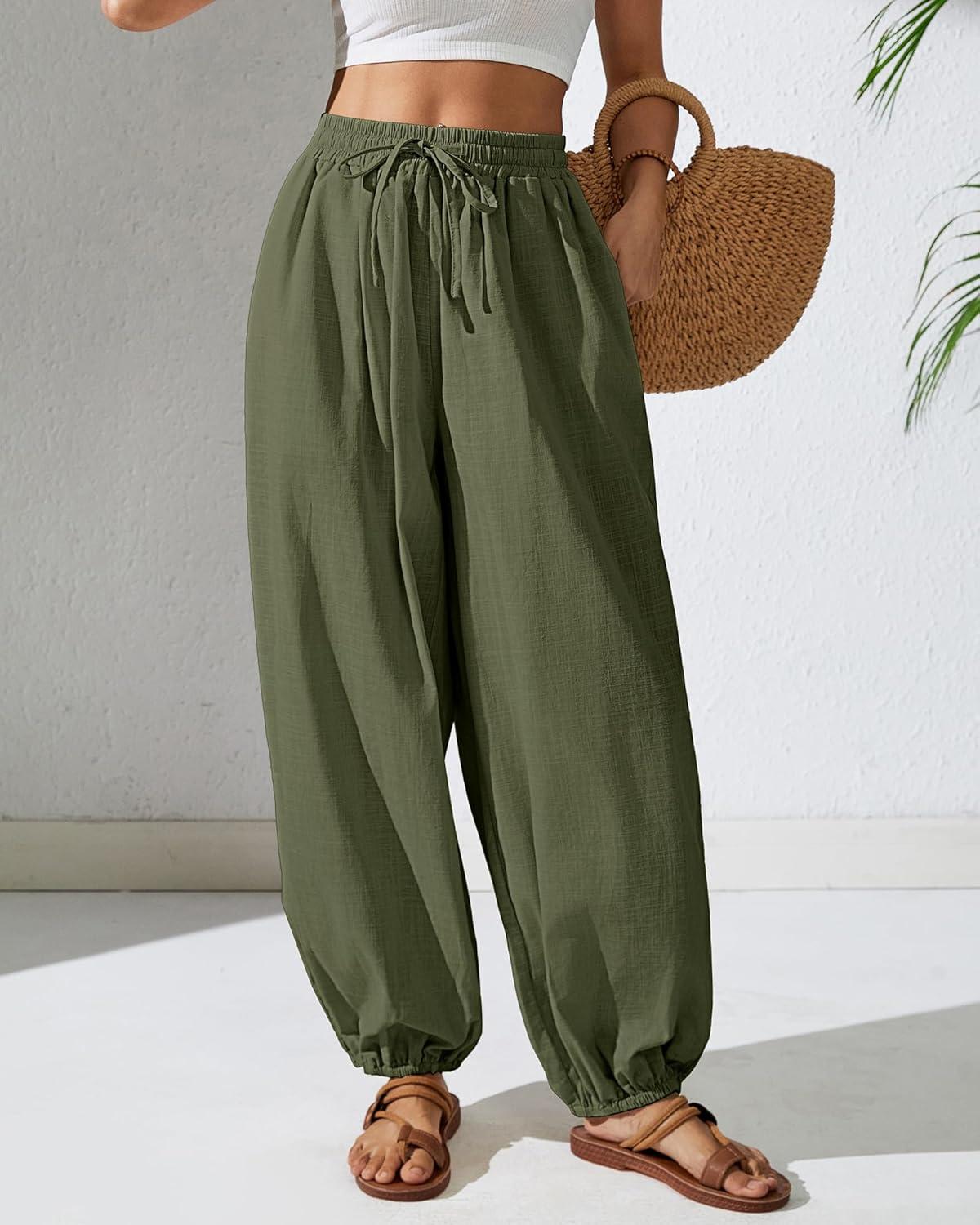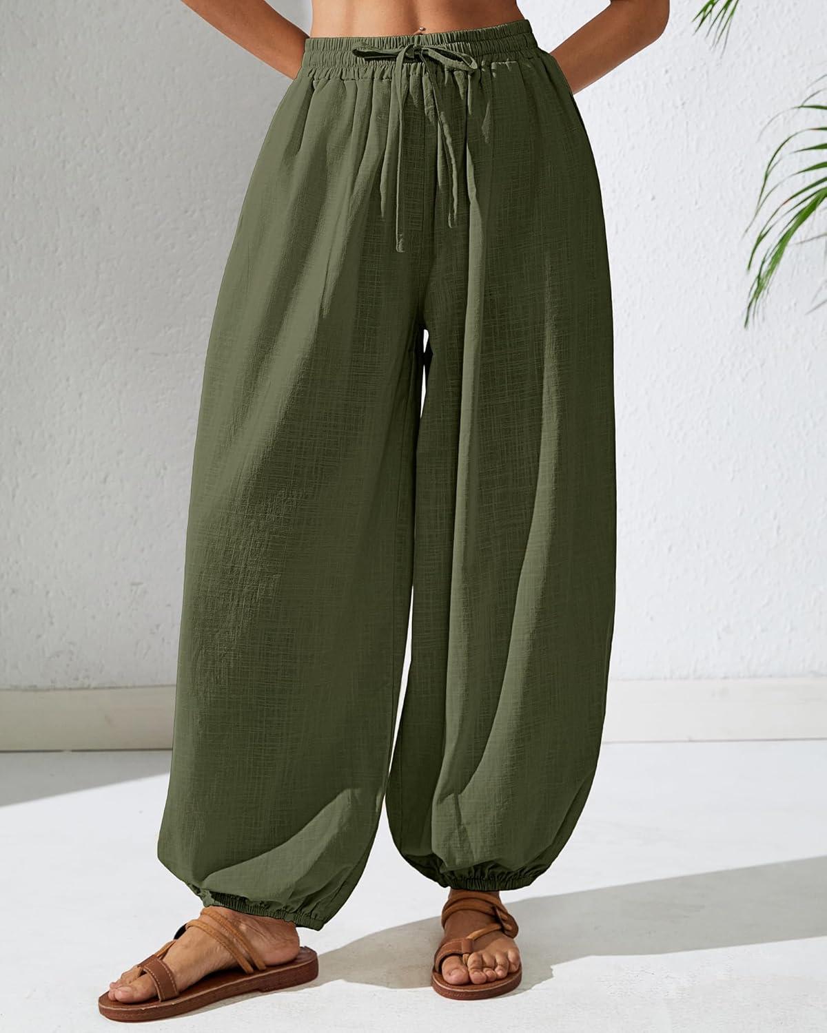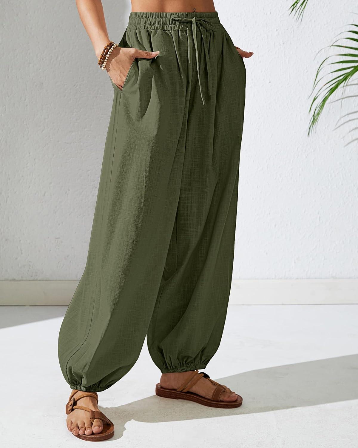 Bsubseach Womens Cotton Harem Pants Elastic Waist Baggy Pant Drawstring Balloon Trouser Loose Beach Pants with Pockets(Army Green)