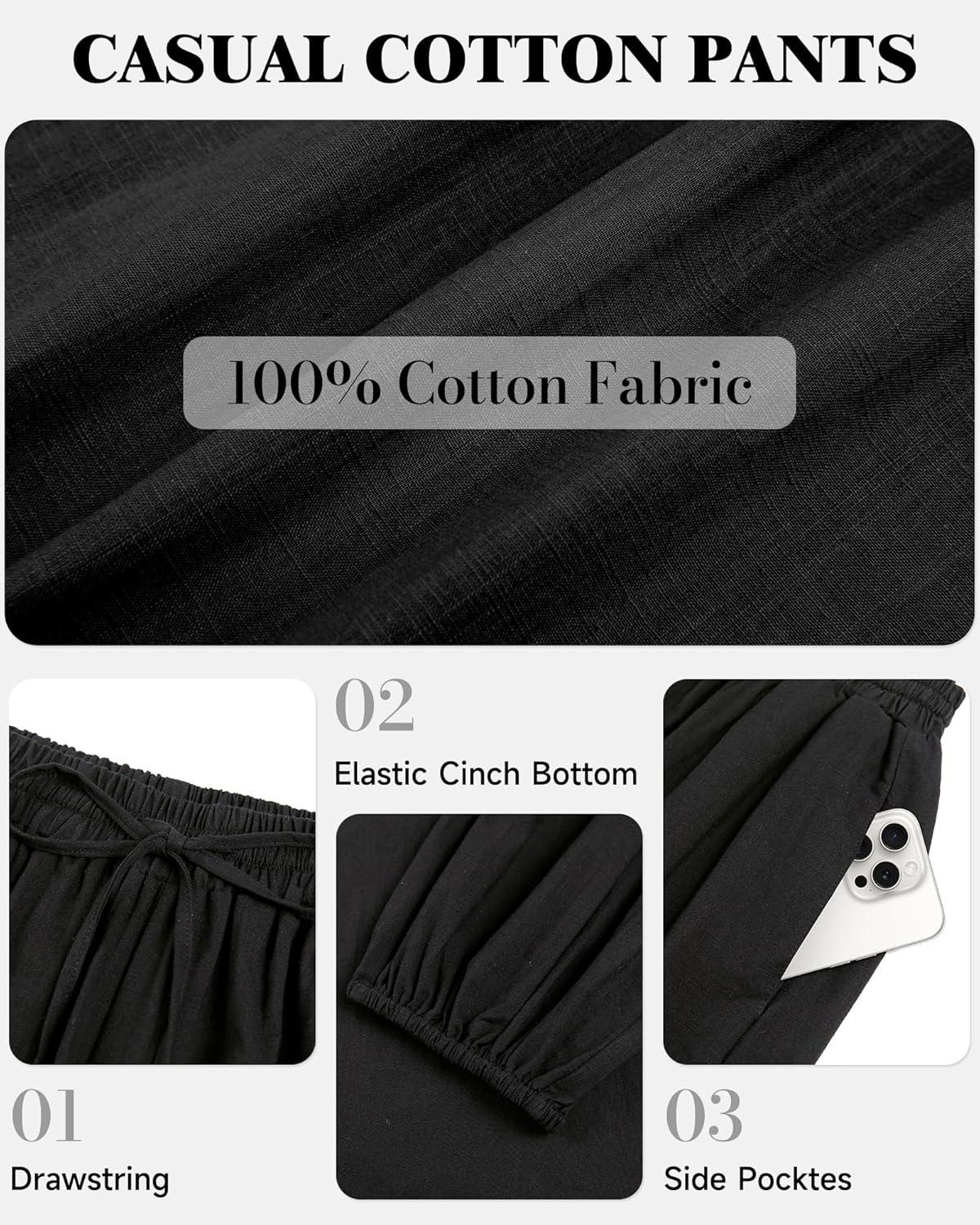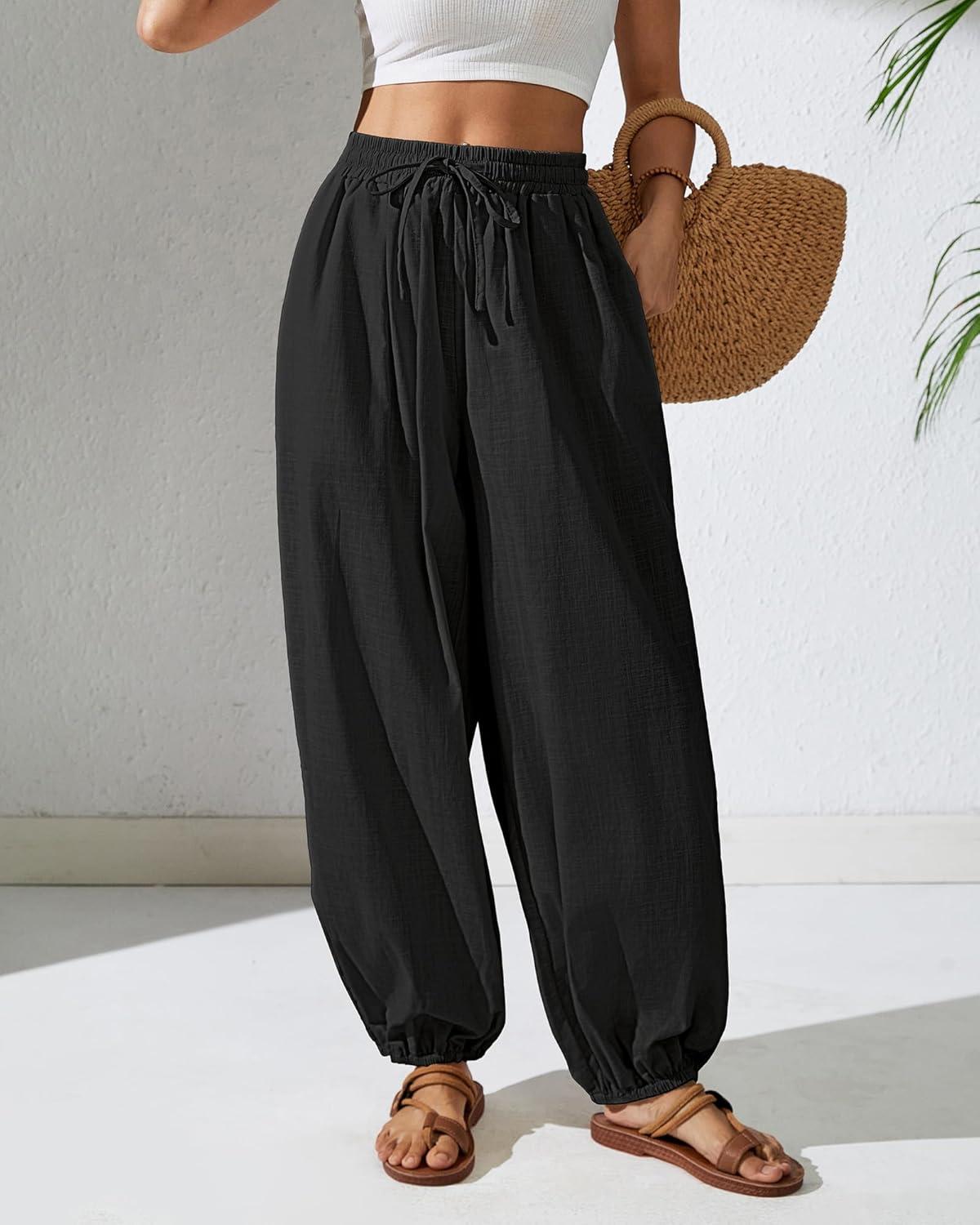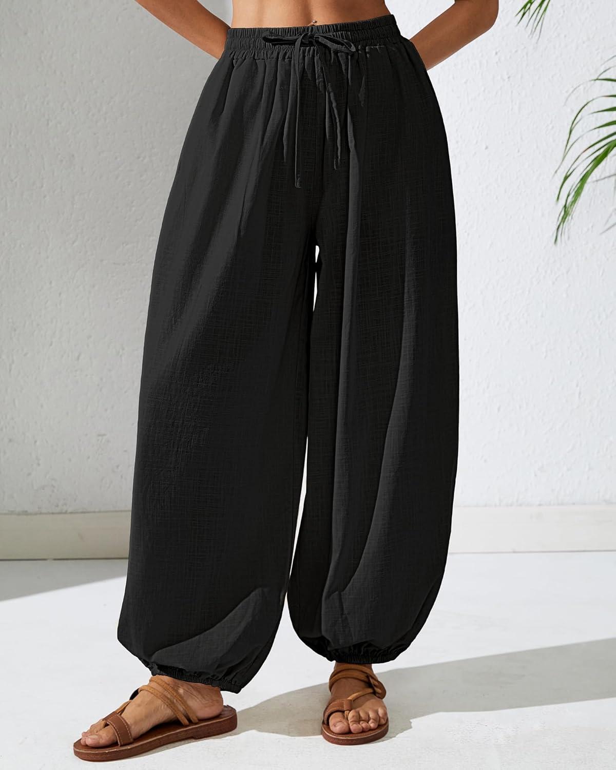 Bsubseach Womens Cotton Harem Pants Elastic Waist Baggy Pant Drawstring Balloon Trouser Loose Beach Pants with Pockets(Black)