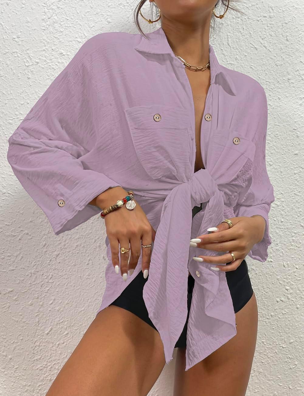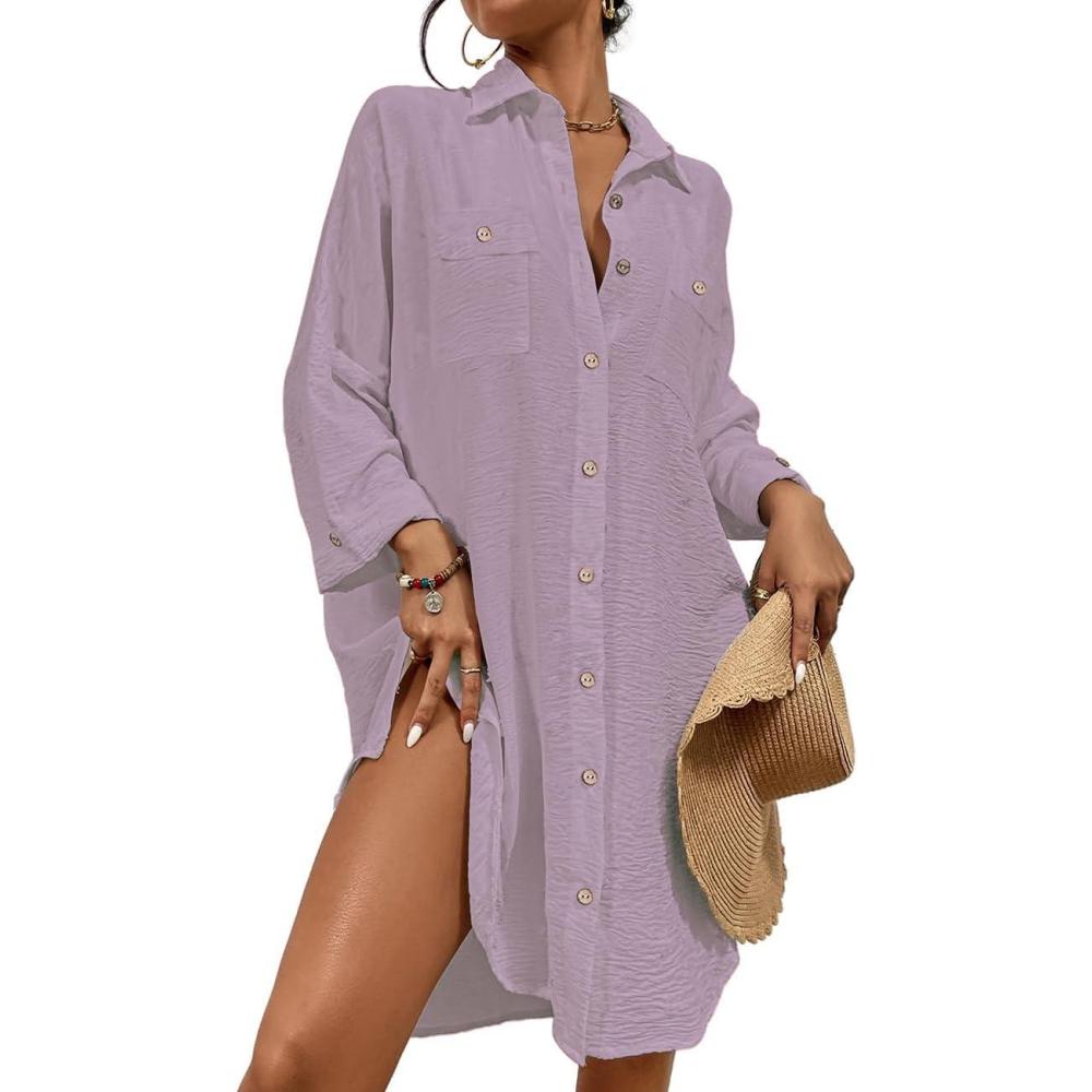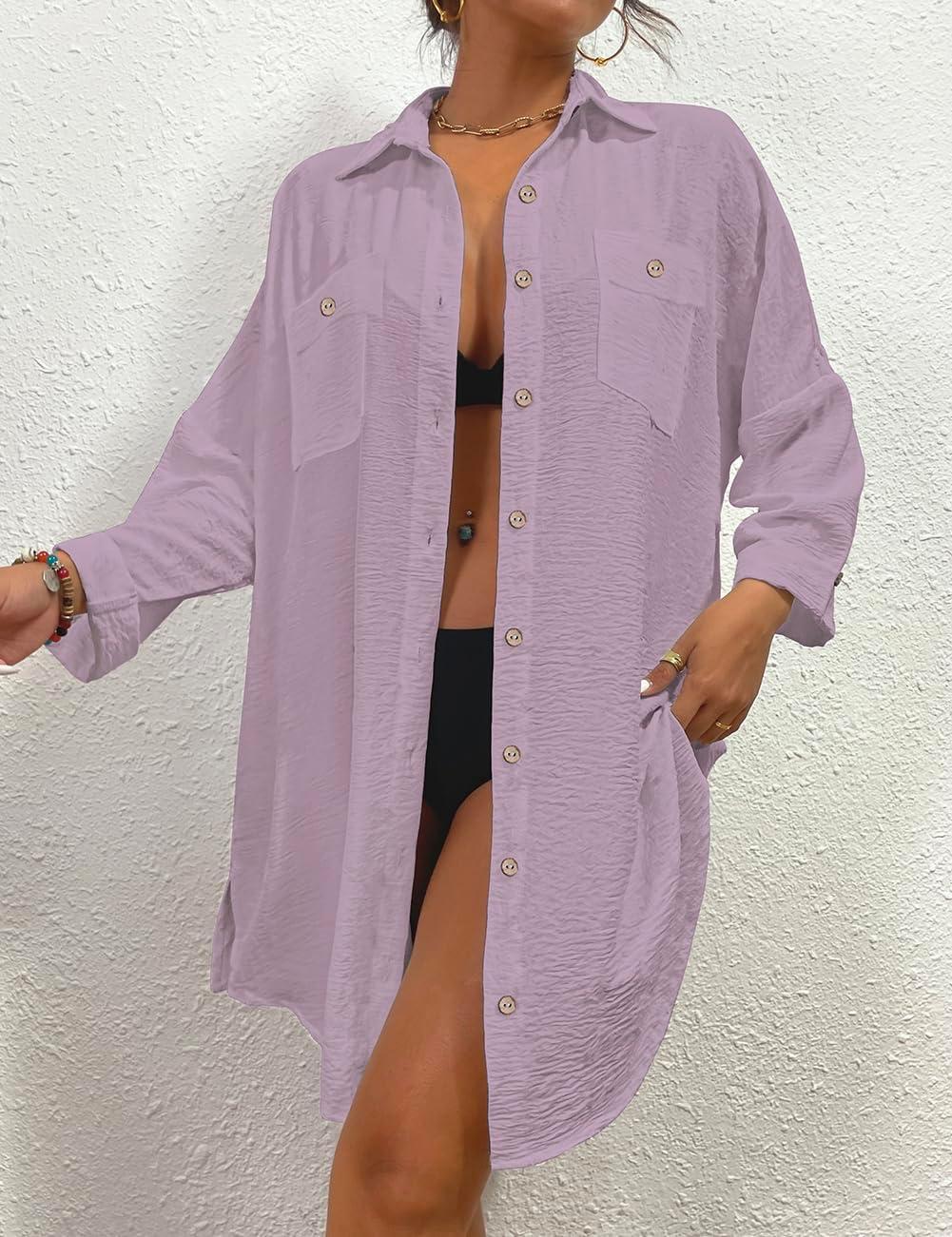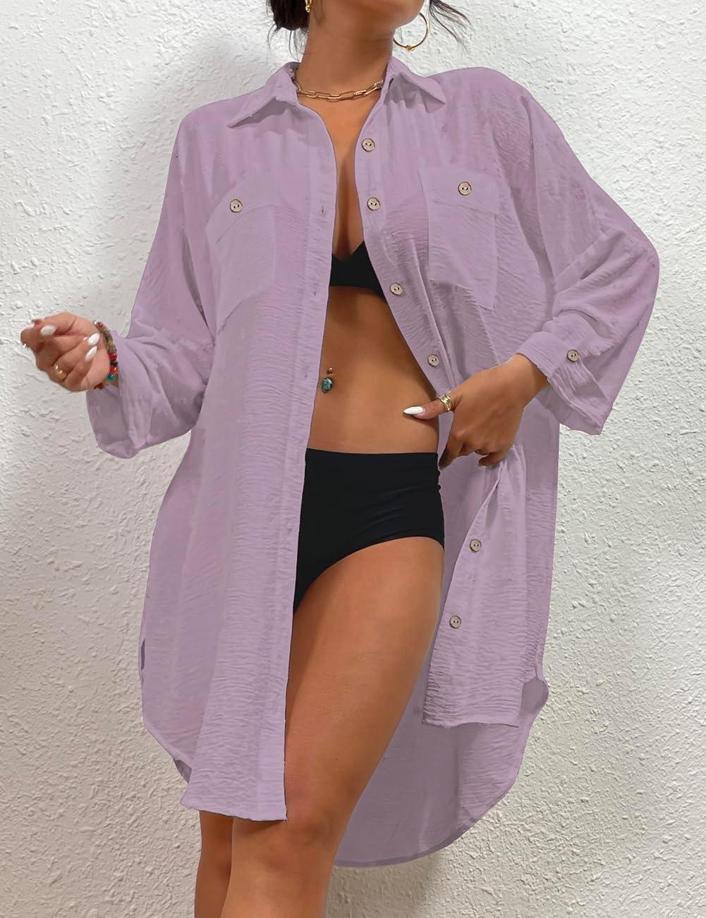 Bsubseach Womens Modern Swimsuit Cover Up Blouse Button Down Shirt Dresses Tops(Light Purple)