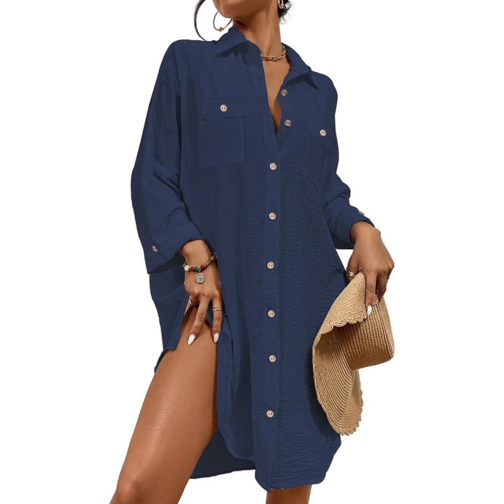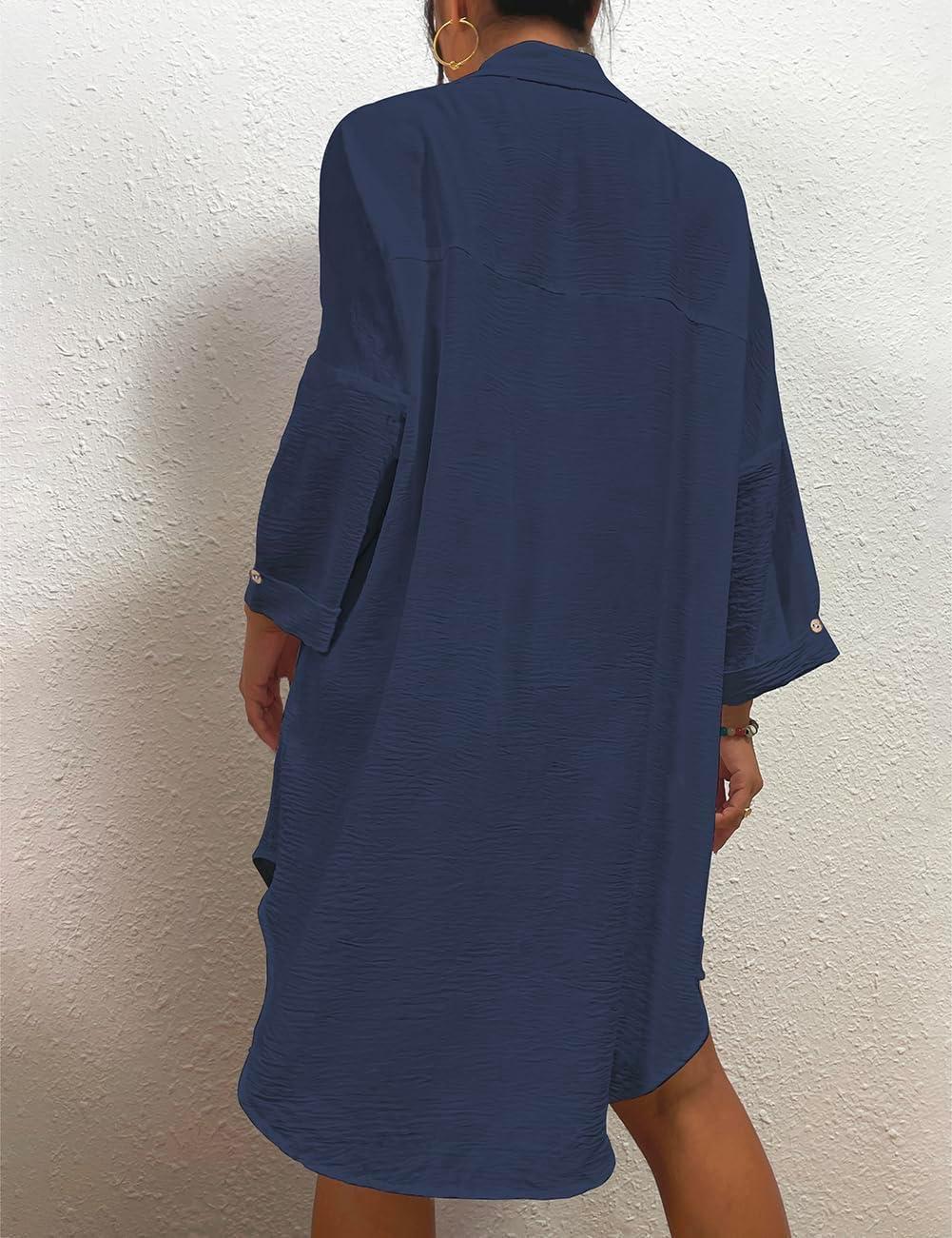 Bsubseach Womens Modern Swimsuit Cover Up Blouse Button Down Shirt Dresses Tops(Navy Blue)