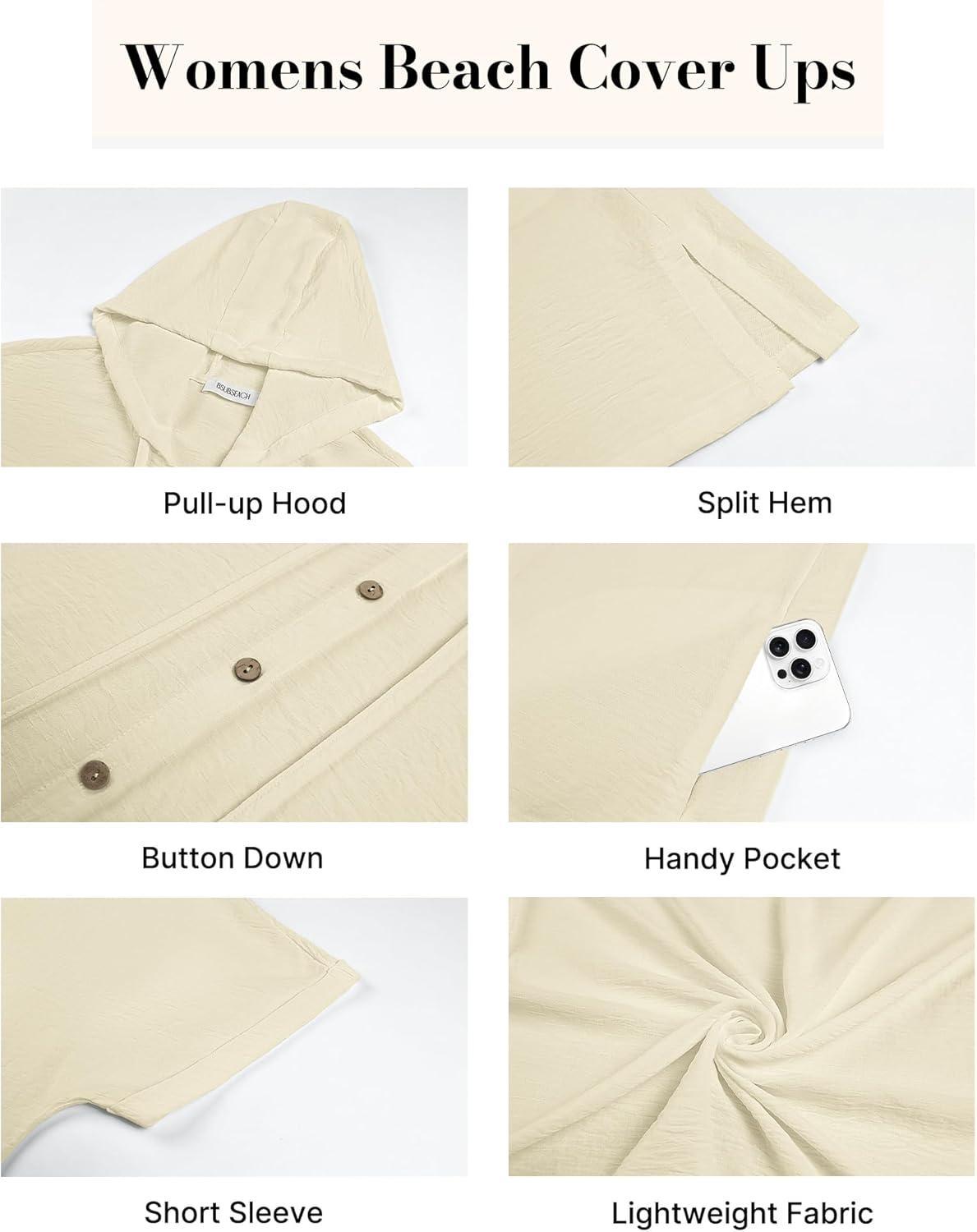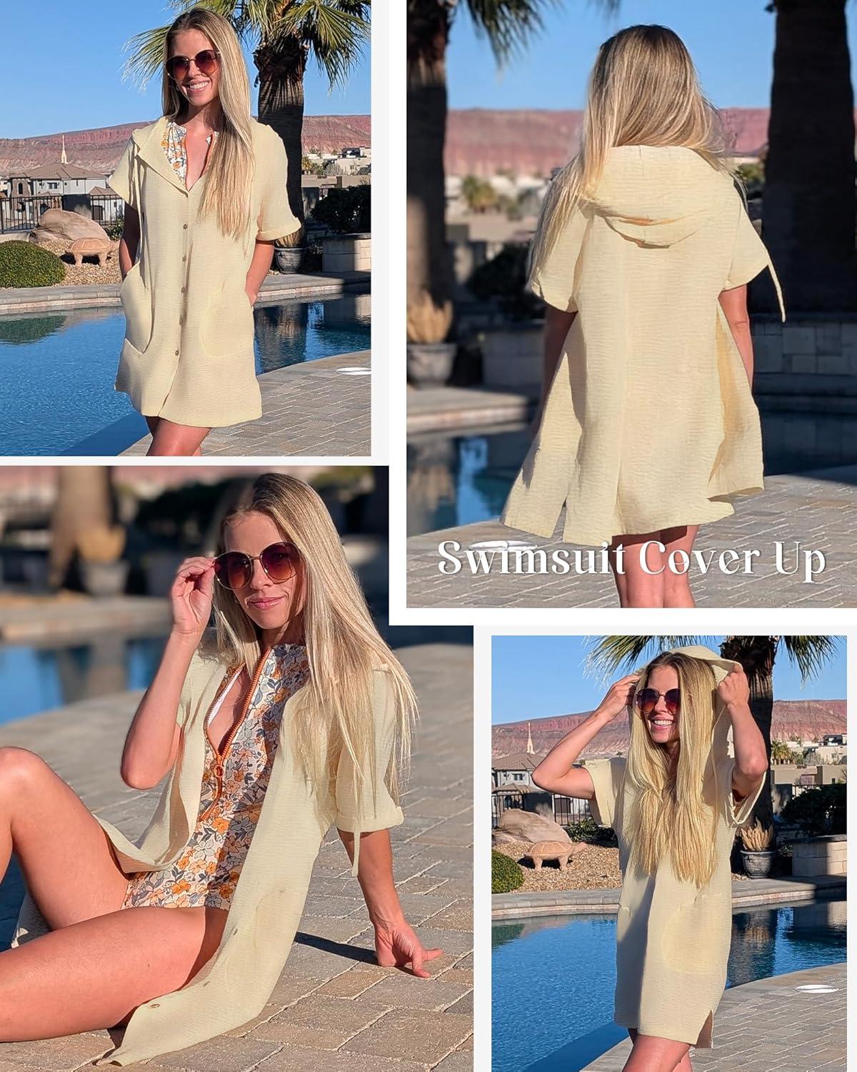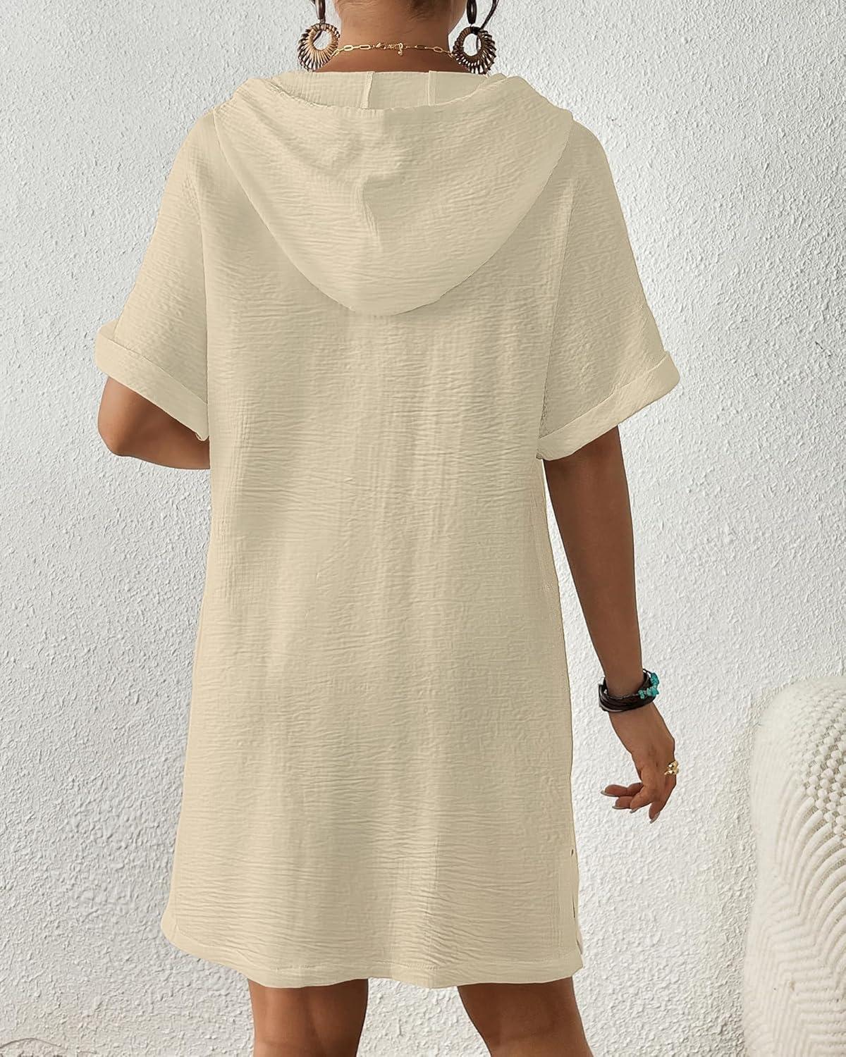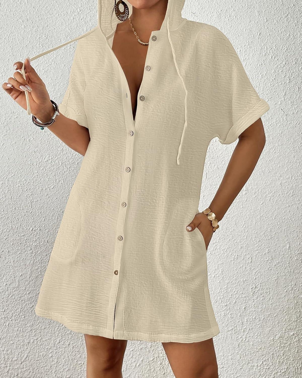 Bsubseach Womens Swimsuit Cover Up Shirt Button Down Short Sleeve Bathingsuit Coverups Hooded Beach Coverup With Pockets(Apricot)