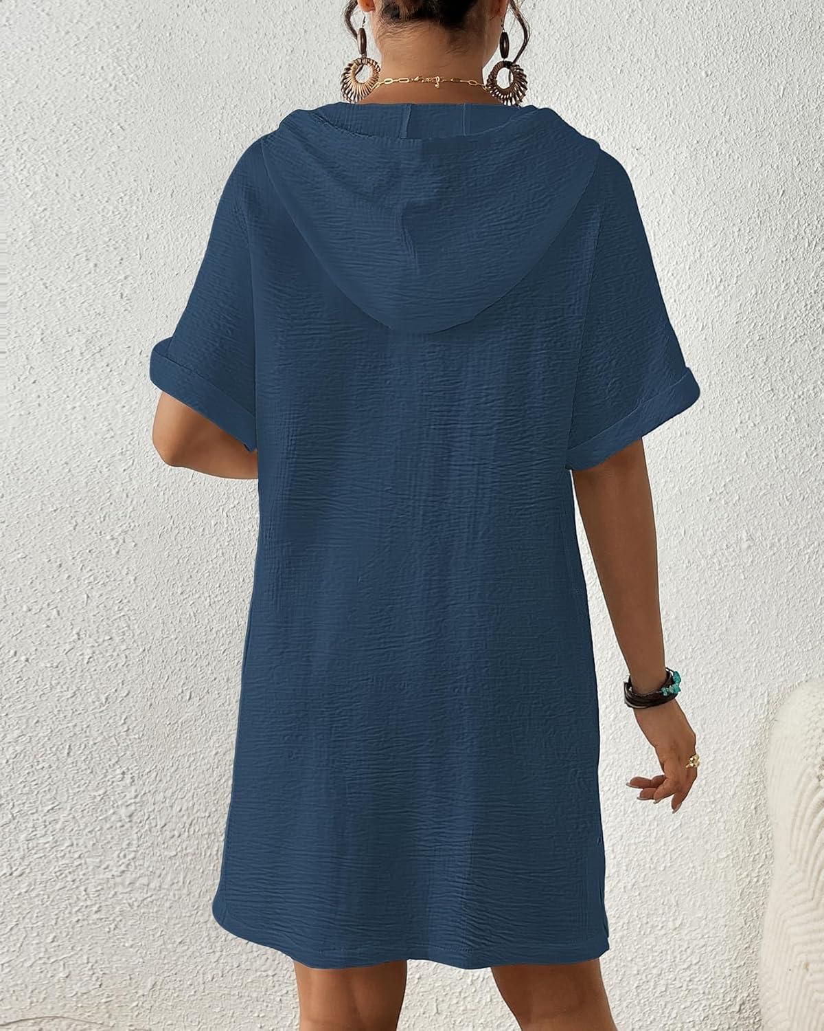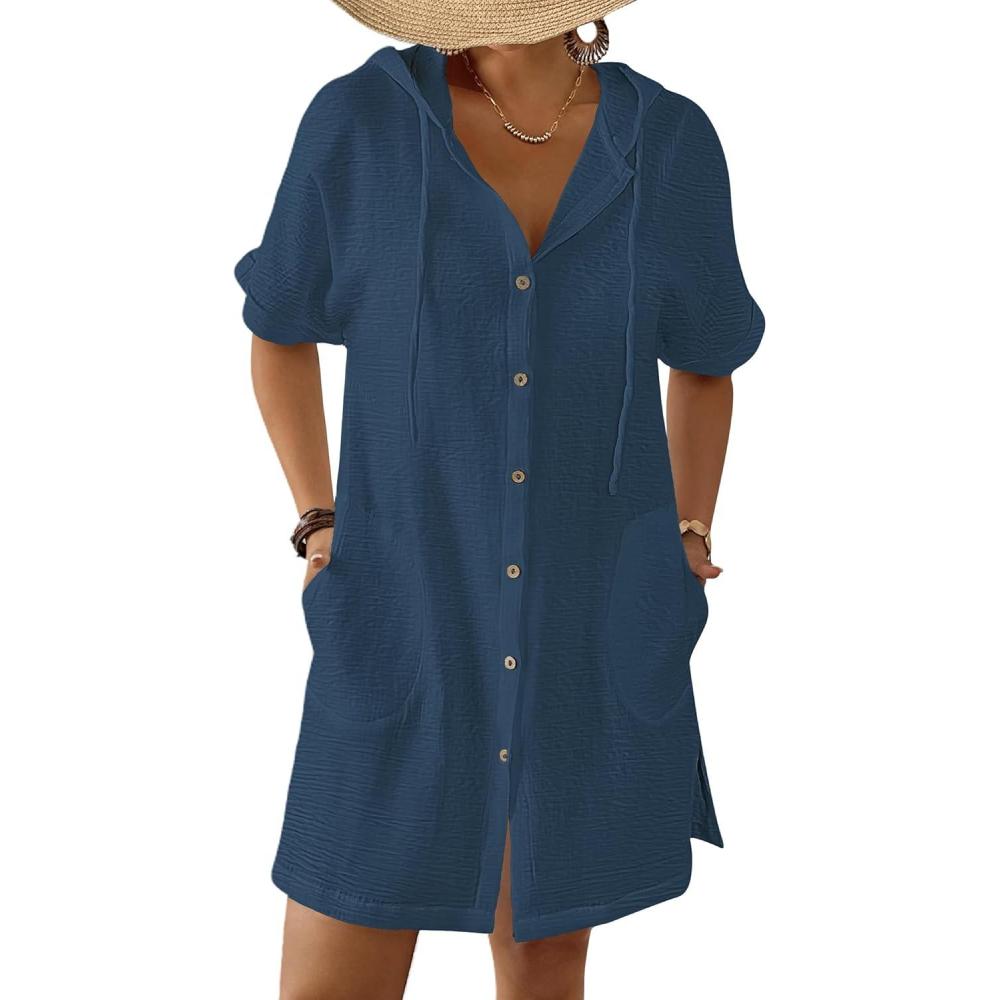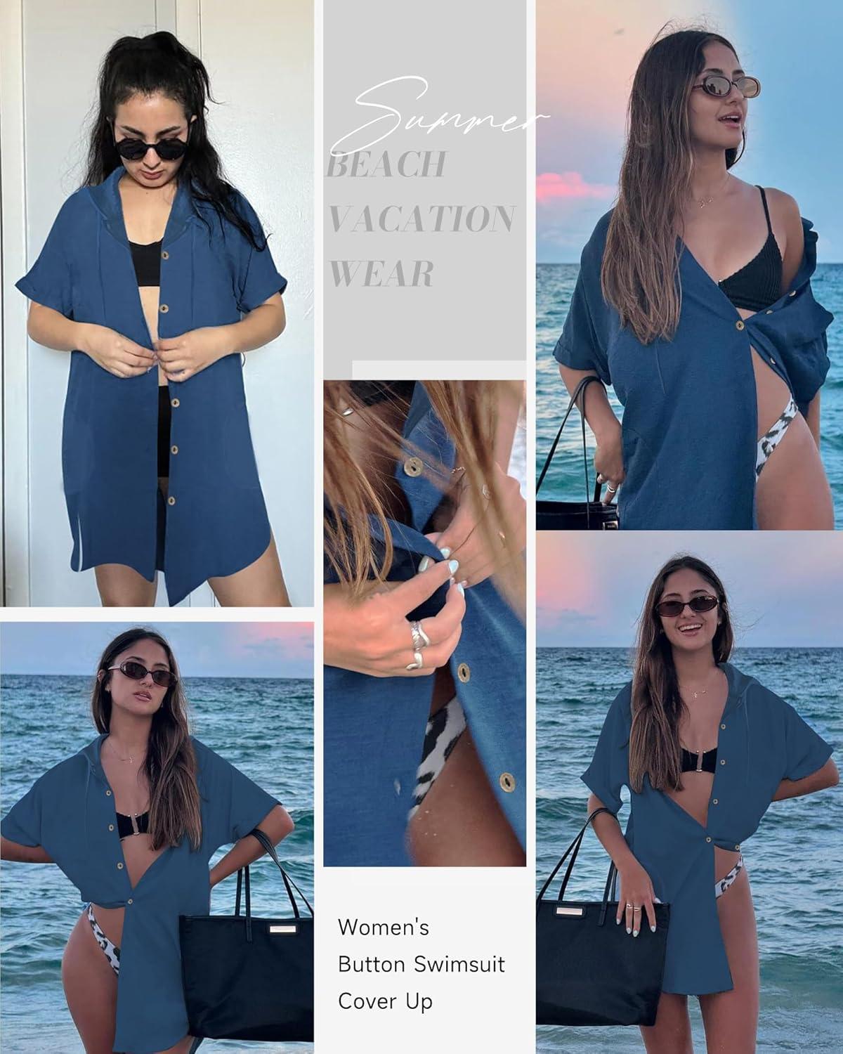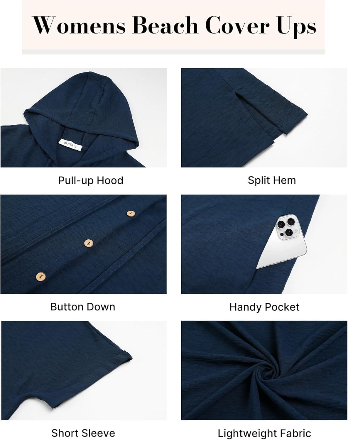 Bsubseach Womens Swimsuit Cover Up Shirt Button Down Short Sleeve Bathingsuit Coverups Hooded Beach Coverup With Pockets(Navy Blue)