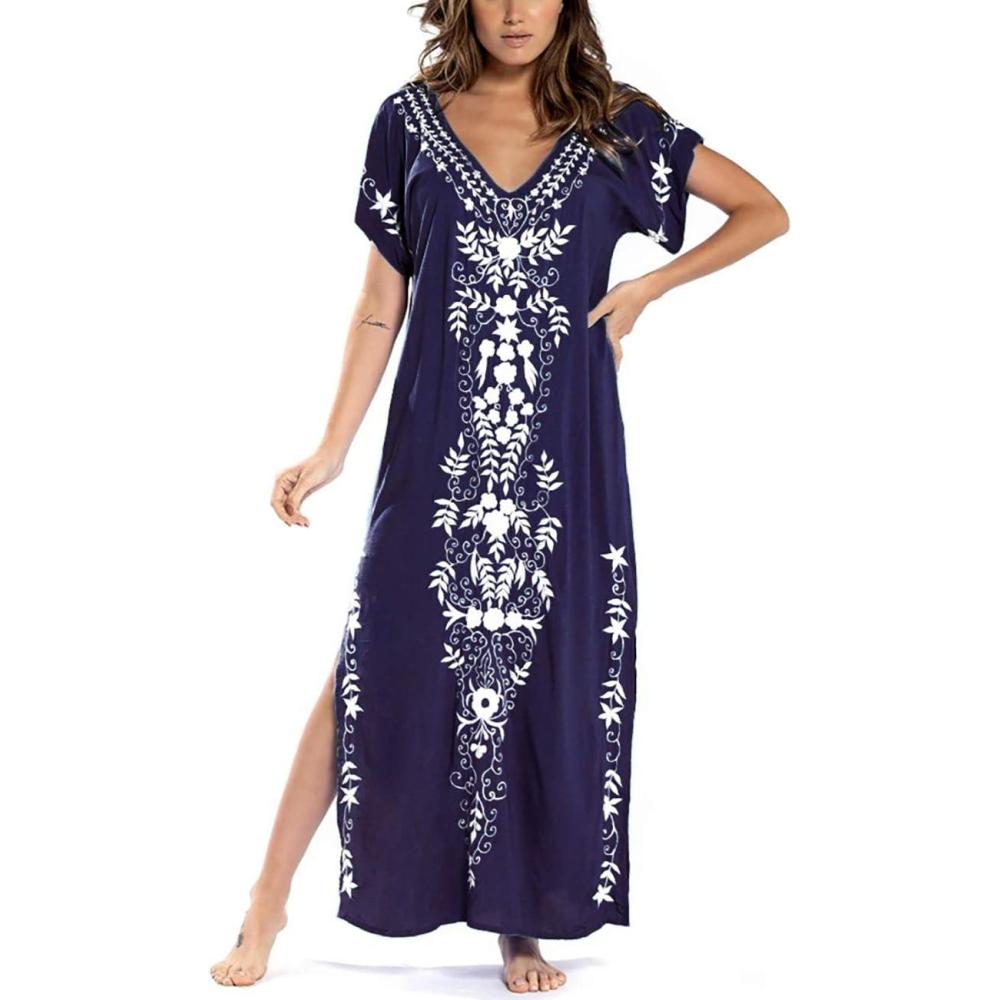 Busbseach Caftan Dresses for Women Embroidery Short Sleeve Beach Cover Up V Neck Maxi Kaftan Dress(W-navy Embroidery)